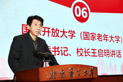 国家老年大学党委书记、校长王启明首先对北京语言大学老年大学、国家老年大学北京语言大学分校的成立表示祝贺,对一直以来关心、支持国家老年大学建设发展的各位领导表示衷心的感谢。随后,他详细介绍了国家老年大学挂牌成立以来所做的工作和取得的成就。他强调,北京语言大学作为教育部直属高校,开办老年大学是落实怀进鹏部长关于国家老年大学建设的指示要求,也是推动老年教育发展的一次探索。针对北语老年大学的未来发展,他提出三点希望:一是共建优质精品课程,扩大老年教育资源供给。希望国家老年大学北语分校结合学校传统办学优势和特色,建设语言类、文化类的精品优质课程,丰富老年教育资源内容;二是共享公共服务平台,探索构建新型老年大学。充分利用公共服务平台,创新线上线下相结合的教学模式,推进老年教育数字化改革;三是共商开放协同的工作机制,推进老年教育高质量发展。国家老年大学将支持国家老年大学北语分校在学员管理、课程建设、教学活动、数据采集等方面先行先试,共同探索老年教育高质量发展的新途径。