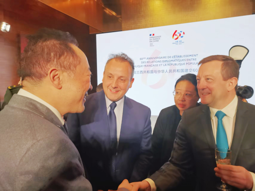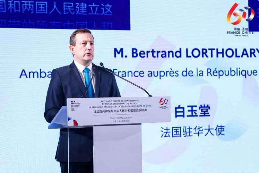 法国驻华大使白玉堂在致辞中表示,60年来,在两国领导人的引领和推动下,法中关系保持高水平发展。法方愿同中方一道,以庆祝两国建交60周年并举办文旅年为契机,保持高层交往势头,积极推动经贸、人文等领域合作,为携手应对全球性挑战、维护世界和平与发展提供解决方案。