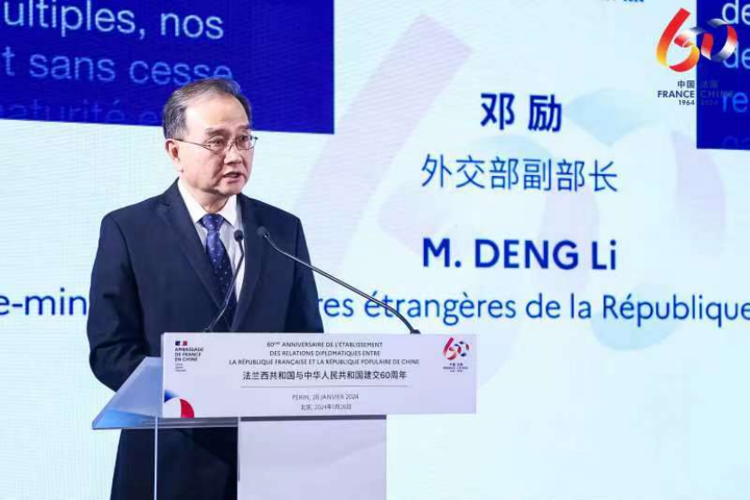 中国外交部副部长邓励在致辞中表示,两国元首在首场庆祝中法建交60周年招待会上发表视频贺词,高度肯定独特的中法精神,回顾两国建交60载光辉历程,积极展望新甲子璀璨未来。尽管世界风云变幻、挑战层出不穷,中法关系却凭借独立自信、开拓进取、开放包容、胸怀天下的精神,日益成为多边主义的践行者、开放发展的倡导者、文明对话的推动者以及全球治理的引领者。双方要坚持互尊互信、携手努力,继续做“向上向善的力量、真诚互信的朋友、互利互惠的伙伴、交流互鉴的典范”。