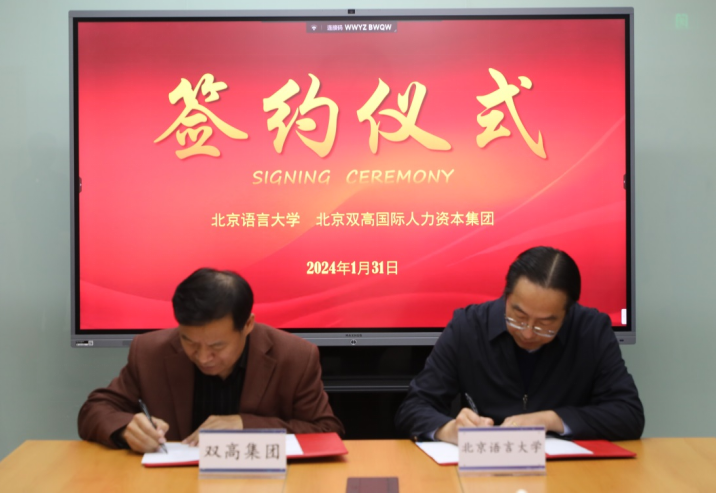 为搭建校企交流合作平台,拓宽毕业生就业渠道,1月31日,北京语言大学与北京双高国际人力资本集团有限公司(简称双高集团)签署共建实习实践基地协议,并举行揭牌仪式。校党委常委、副校长黄益方,心理学院院长江新,语言科学院党总支书记彭恒利,双高集团党委书记、董事长彭方军,双高集团党委委员、副总经理郭忠良以及相关部门负责人出席仪式。仪式由郭忠良副总经理主持。