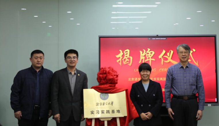心理学院院长江新、语言科学院党总支书记彭恒利、双高集团副总经理郭忠良、双高集团人才与领导力测评二部总经理王亮共同为“北京语言大学实习实践基地”揭牌。