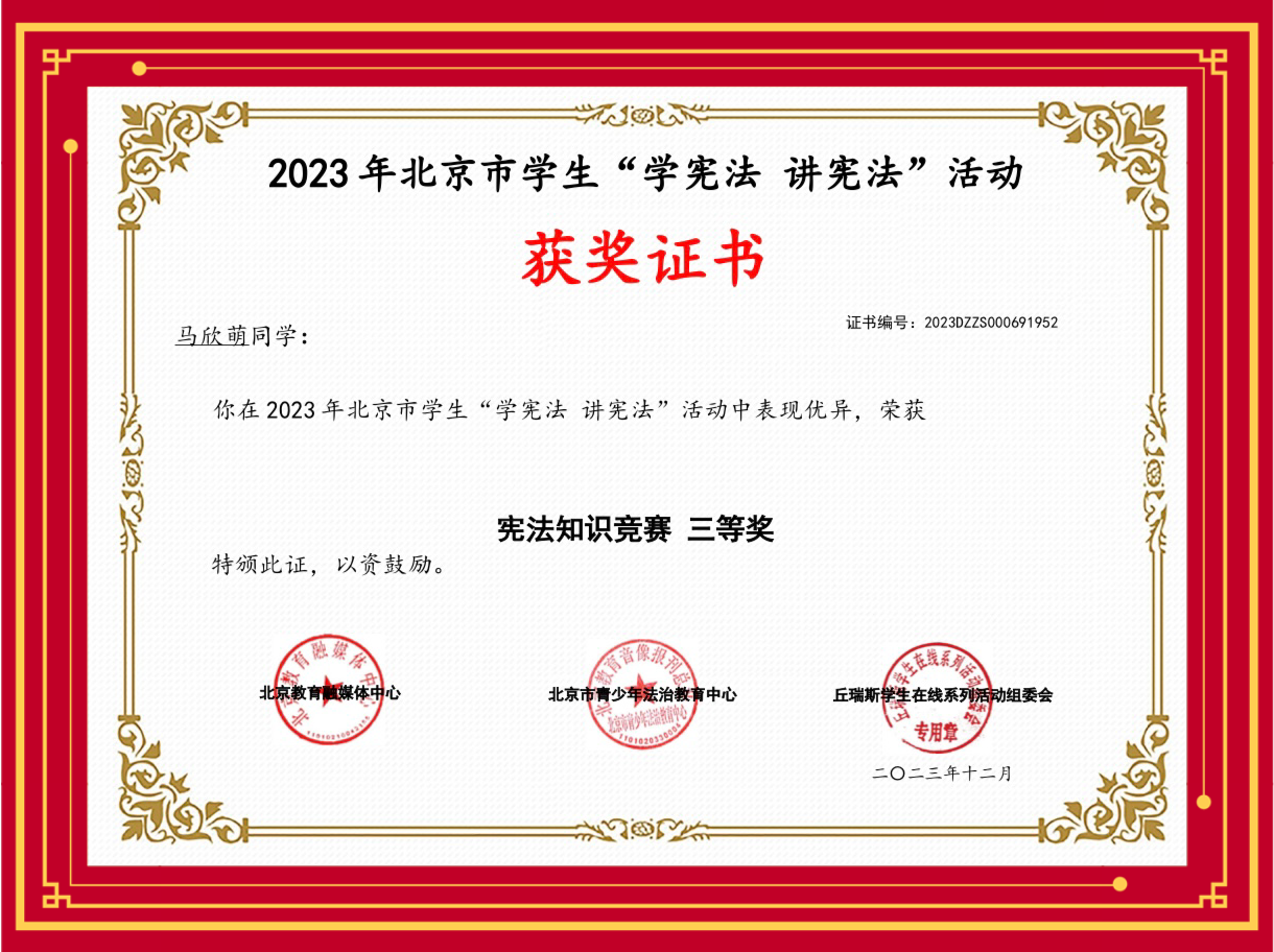 近日,2023年学生“学宪法 讲宪法”活动圆满落幕,我校外国语学部东方语言文化学院2021级日语系本科生马欣萌同学荣获2023年北京市学生“学宪法 讲宪法”活动宪法知识竞赛三等奖。