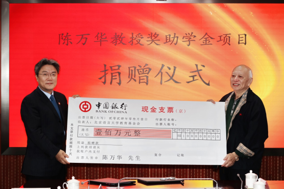 3月1日,麦克马斯特大学金融及商业经济学教授、北京语言大学名誉博士陈万华(Man-Wah Luke Chan)先生奖助学金捐赠仪式在我校综合楼909会议室举行。出席仪式的有北京语言大学副校长、北语教育基金会理事长张宝钧,商学院院长宋晓玲,商学院书记张政,北语基金会秘书长金珂,商学院师生代表和基金会的工作人员。