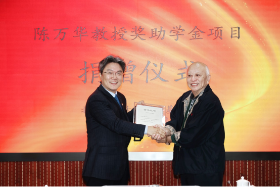 在捐赠仪式上,张宝钧副校长和陈万华先生在捐赠协议书上签字,张宝钧副校长代表学校向陈先生颁发捐赠证书。