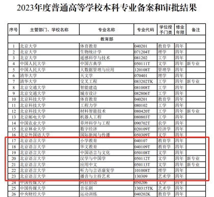 3月19日,教育部发布《关于公布2023年度普通高等学校本科专业备案和审批结果的通知》,学校申报的听力与言语康复学、小学教育、华文教育、中国语言与文化、汉学与中国学、应用中文、播音与主持艺术等7个专业获准增设,其中,汉学与中国学、应用中文2个专业为首次列入教育部普通高等学校本科专业目录的新专业。截至目前,学校本科专业增至51个,学科涵盖文学、理学、工学、经济学、管理学、法学、教育学、历史学、艺术学、医学、交叉学科等十一个学科门类。