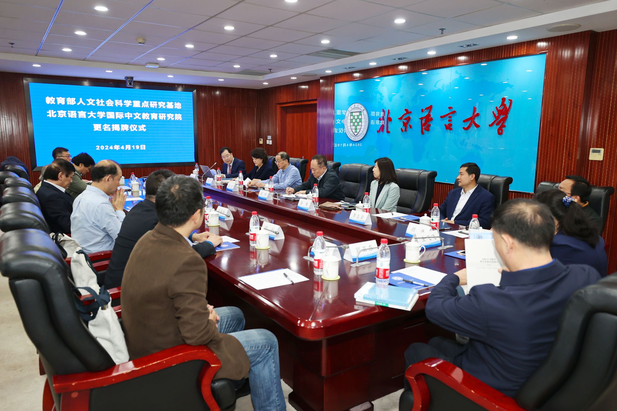 4月19日,教育部人文社会科学重点研究基地北京语言大学国际中文教育研究院更名揭牌仪式隆重举行,会议由基地主任、院长吴应辉主持。北京语言大学校长段鹏出席仪式并致辞、校党委副书记魏晖宣读教育部同意基地更名批复文件。出席本次仪式的还有世界汉语教学学会会长、全国汉语国际教育专业学位研究生教育指导委员会副主任委员、天津师范大学前校长钟英华,北京语言大学国际中文教育资深学者刘珣先生,北京师范大学国际中文教育学院党委书记、全国汉语国际教育教指委委员王学松,全国汉语国际教育教指委委员、北京师范大学教授宋继华,中央民族大学国际教育学院院长陈天序,北京外国语大学科研处处长张天伟,新疆师范大学国际文化交流学院院长邓新、副院长李敬欢、教授郭卫东,浙江师范大学国际文化与社会发展学院院长王辉,以及北京语言大学党委常委、组织部部长张健教授,学校办公室主任李志坚主任,科研处副处长金飞飞,发展规划与学科建设办公室主任颜伟,语言科学院院长曹文,国际学生教育政策与评价研究院院长王佶旻,汉学与中国学学院常务副院长李萍,国际中文学院党委书记梁彦民、院长沈庶英,应用中文学院院长苏英霞,教师教育学院院长施家炜、教授杨玉玲。参会本次会议的还有国际中文教育研究院教师及在读博士、硕士研究生。