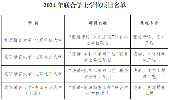 近日,学校与北京科技大学、北京林业大学、北京化工大学、中国石油大学(北京)联合申报的“西班牙语+采矿工程”“德语+木材科学与工程”“法语+化学工程与工艺”“俄语+资源勘查工程”等4个联合学士学位项目获批。这是继2023年“阿拉伯语+石油工程”联合学士学位项目顺利实施后,学校面向经济社会发展需求调整学科专业布局、推动文科与理工农医学科交叉融合的进一步探索,也是培养国家急需的拔尖创新人才的重要举措。