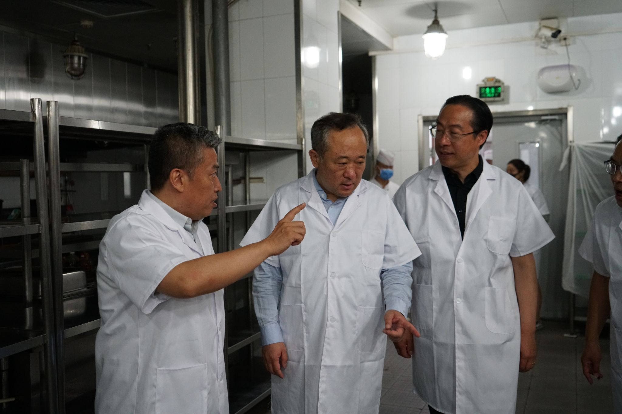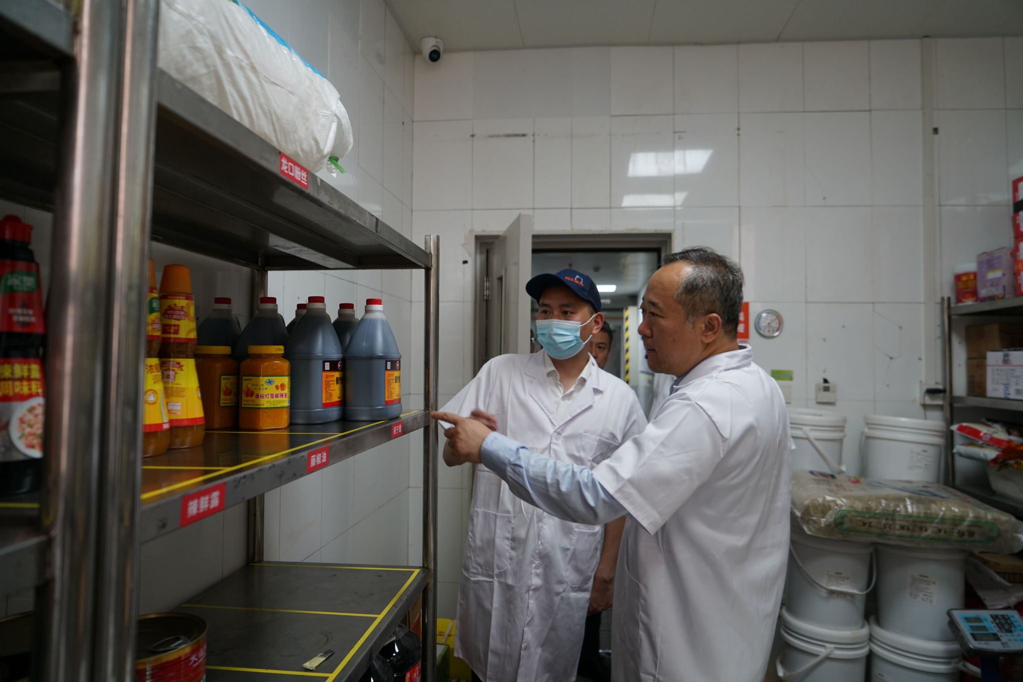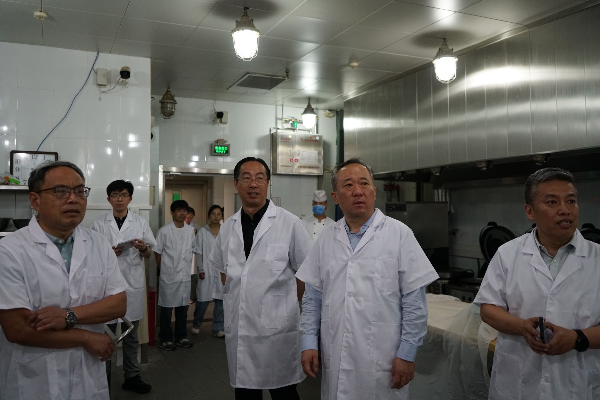 段鹏校长一行首先走进清晏楼食堂后厨,依次检查了米饭加工间、主食加工间、切肉间、化验室和库房。然后又来到清晏楼三层快乐食间,对切菜间、选菜区以及留样间等进行了检查。检查过程中段鹏校长详细了解了食材来源,加工过程以及食品留样等情况。他强调“食品安全无小事”,要严把食品加工、售卖各个环节,严格操作规程,时刻把食品安全放在首位,为师生提供安全饮食、健康饮食,推陈出新,满足广大师生多样化的就餐需求。