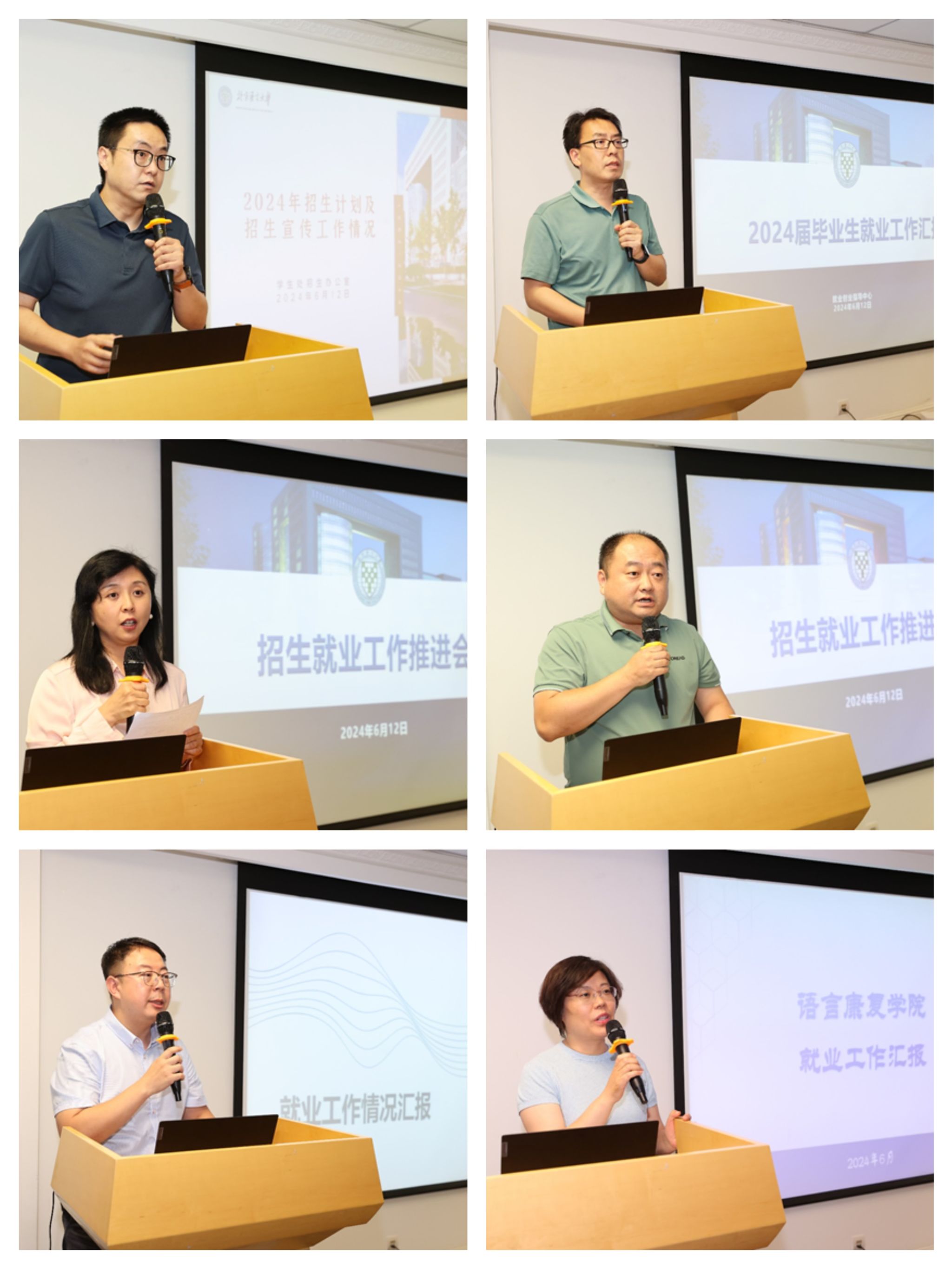 本科招生办公室主任王悦介绍了2024年招生计划及招生宣传工作安排,就业创业指导中心主任刘喆介绍了2024届毕业生就业进展情况。外国语学部副主任穆杨和广西、海南招生宣传组组长张阳分别介绍了招生宣传工作相关的经验做法和意见建议。新闻传播学院党总支书记杨天乔、语言康复学院党总支副书记(主持工作)刘志敬分别围绕本单位毕业生就业创业工作情况进行交流分享。