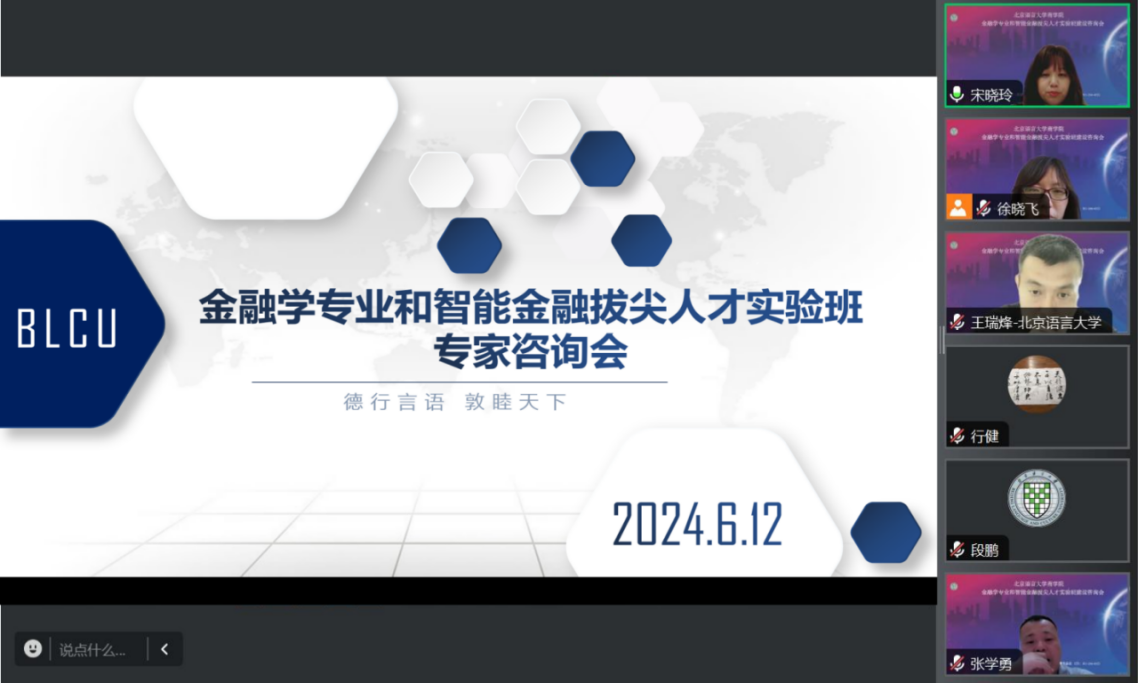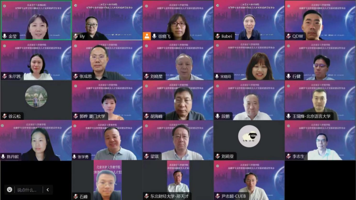 6月12日下午,商学院金融学专业和智能金融拔尖人才实验班建设咨询会在线上召开。北京语言大学校长段鹏出席会议,会议由北京语言大学教务处处长王瑞烽主持。本次咨询会诚邀南开大学党委副书记梁琪教授,西南财经大学副校长李志生教授,首都经济贸易大学副校长尹志超教授,广东金融学院副校长易行健教授,上海财经大学校长助理刘莉亚教授,东南大学首席教授、人文社科学部委员、金融系主任刘晓星,东北财经大学金融学科专业带头人、青岛金融研究院执行院长邢天才教授,中国人民大学财政金融学院副院长张成思教授,北京师范大学经济与工商管理学院金融系主任胡海峰教授,厦门大学经济学院副院长郭晔教授,中央财经大学金融学院院长张学勇教授等11名业内专家参加。商学院院长宋晓玲、副院长祁大伟、副院长朱尔茜、金融系主任徐晓飞等近30位领导、老师参加了本次会议。