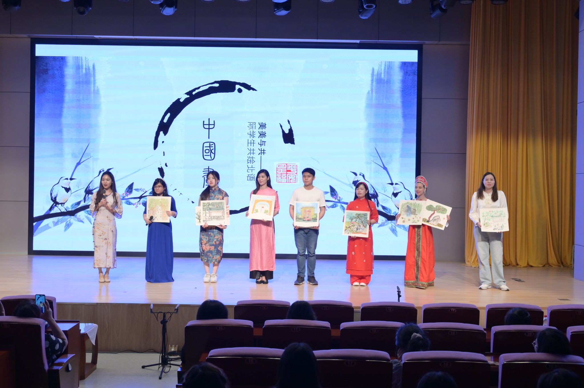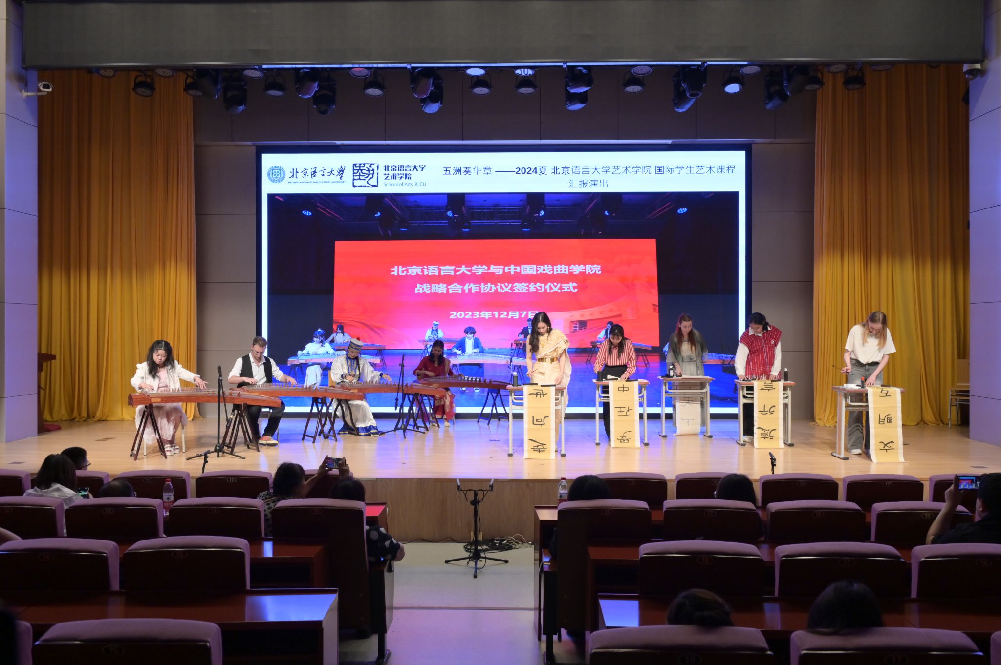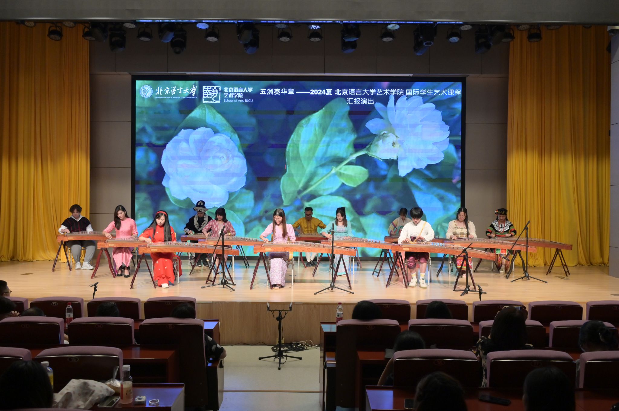 6月13日晚,北京语言大学国际学生艺术课程汇报在教一楼209报告厅成功举办,活动得到了国际教育管理处、汉学与中国学学院、国际中文学院和应用中文学院的大力支持。此次汇报演出由来自20多个国家的60余位国际学生共同参与,他们在本学期选修了艺术学院开设的中国书法练习、汉字与书法、中国画、古筝、声乐等多门课程,学生们通过这些课程深入体验和学习中国传统艺术。校党委副书记魏辉,宣传部副部长卜晨光、汉语国际中文学院院长沈庶英、应用国际中文学院院长苏英霞,艺术学院党总支书记陈霞、副院长史大鹏,中国知名词曲作家、资深音乐制作人刘尊老师等参加活动。