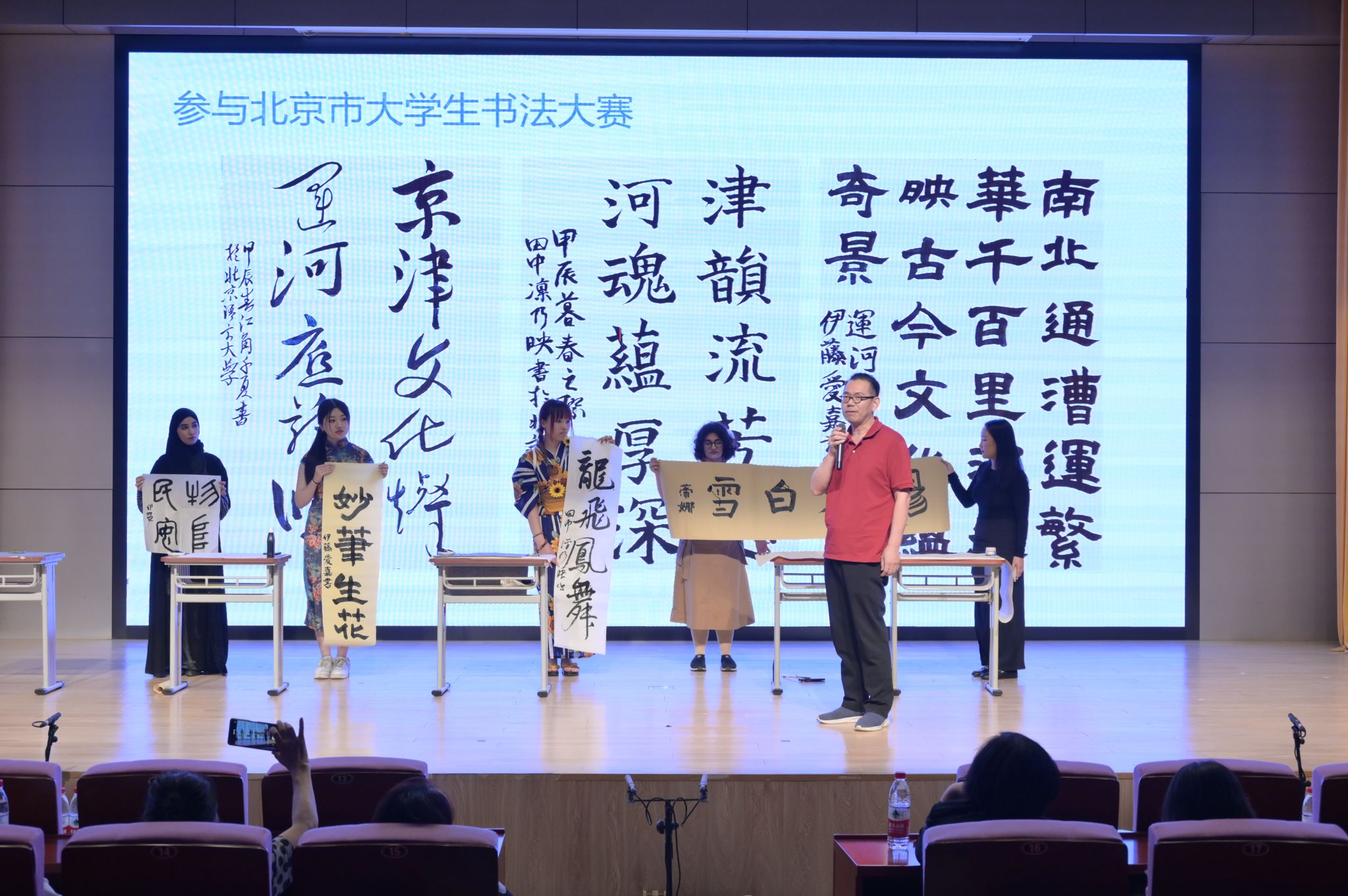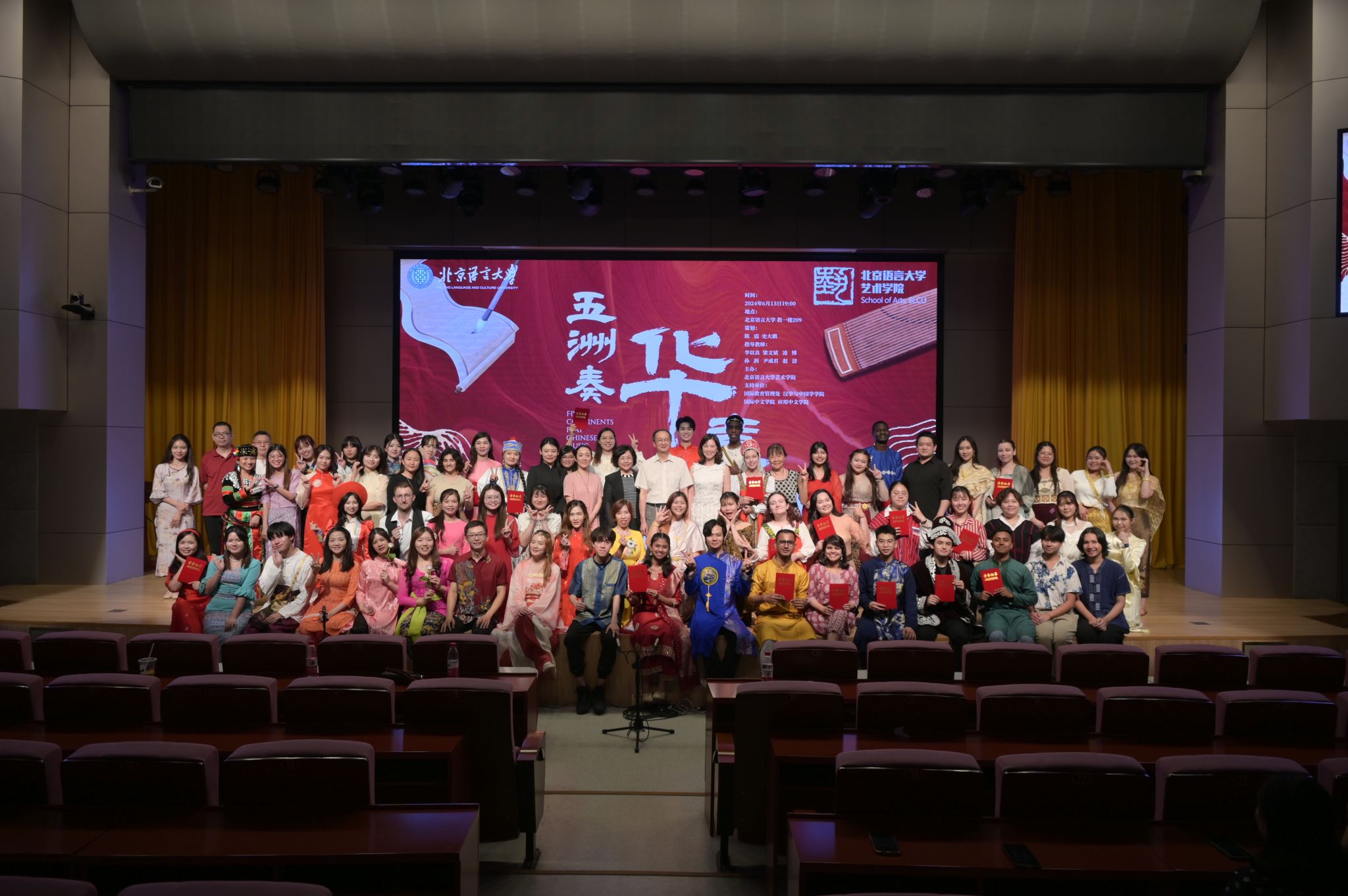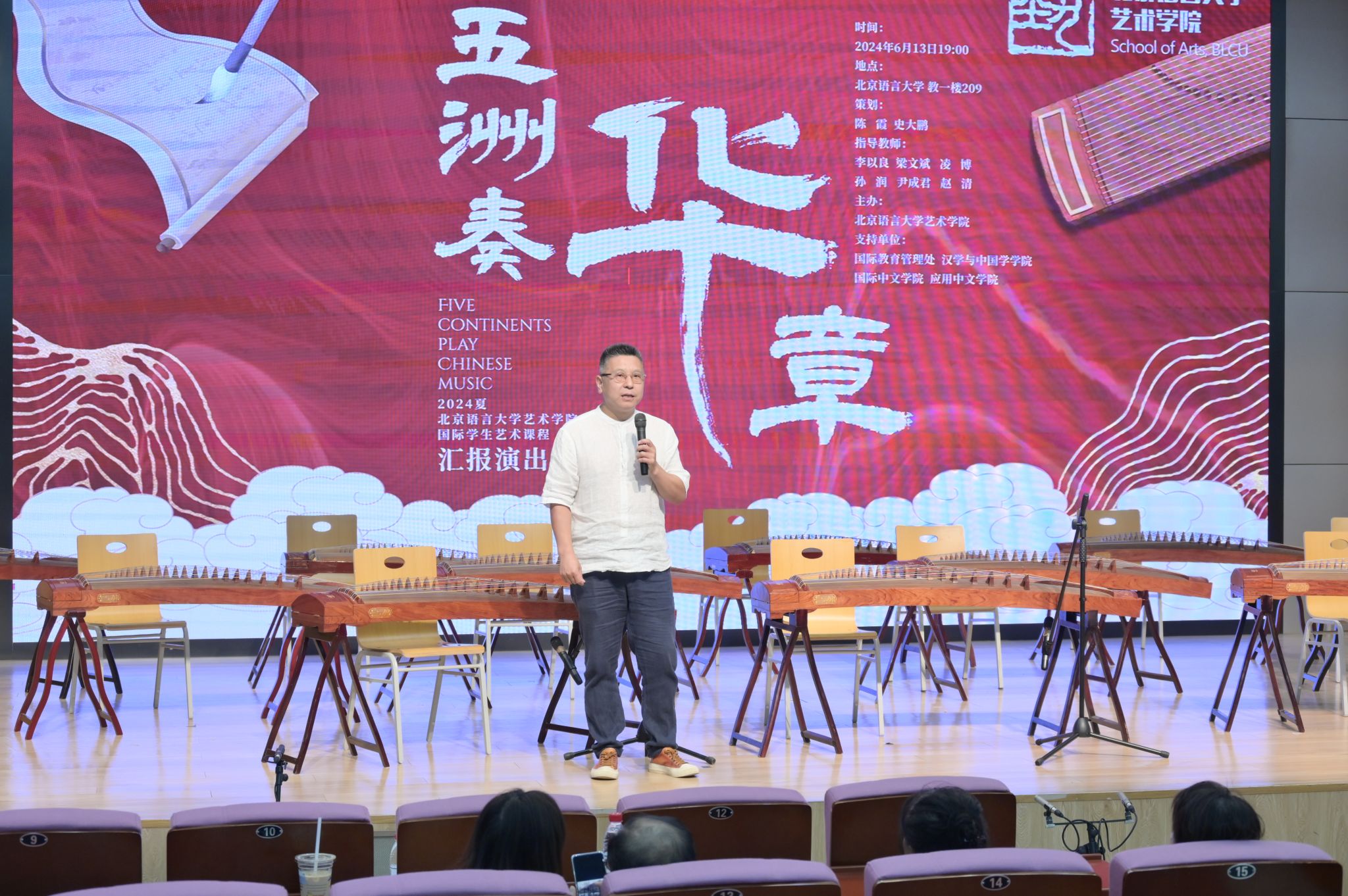 6月13日晚,北京语言大学国际学生艺术课程汇报在教一楼209报告厅成功举办,活动得到了国际教育管理处、汉学与中国学学院、国际中文学院和应用中文学院的大力支持。此次汇报演出由来自20多个国家的60余位国际学生共同参与,他们在本学期选修了艺术学院开设的中国书法练习、汉字与书法、中国画、古筝、声乐等多门课程,学生们通过这些课程深入体验和学习中国传统艺术。校党委副书记魏辉,宣传部副部长卜晨光、汉语国际中文学院院长沈庶英、应用国际中文学院院长苏英霞,艺术学院党总支书记陈霞、副院长史大鹏,中国知名词曲作家、资深音乐制作人刘尊老师等参加活动。