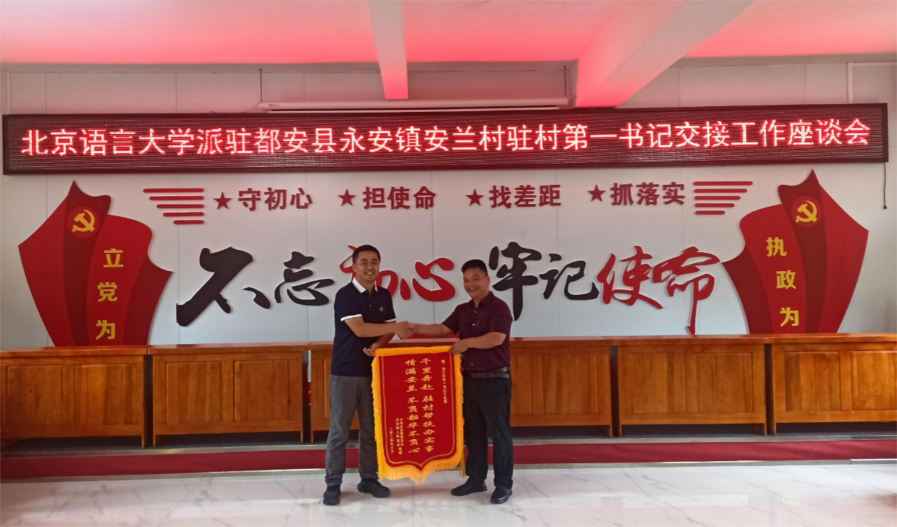 上一任都安县永安镇安兰村驻村第一书记王金超就驻村以来的工作情况进行了简要汇报,表达了对学校和都安的感谢、对当地群众的不舍。我校后勤服务集团安全运行保障部副主任、新任驻村第一书记牛涛作了表态发言,表示将尽快融入驻村工作,不负学校嘱托和都安人民的期望。