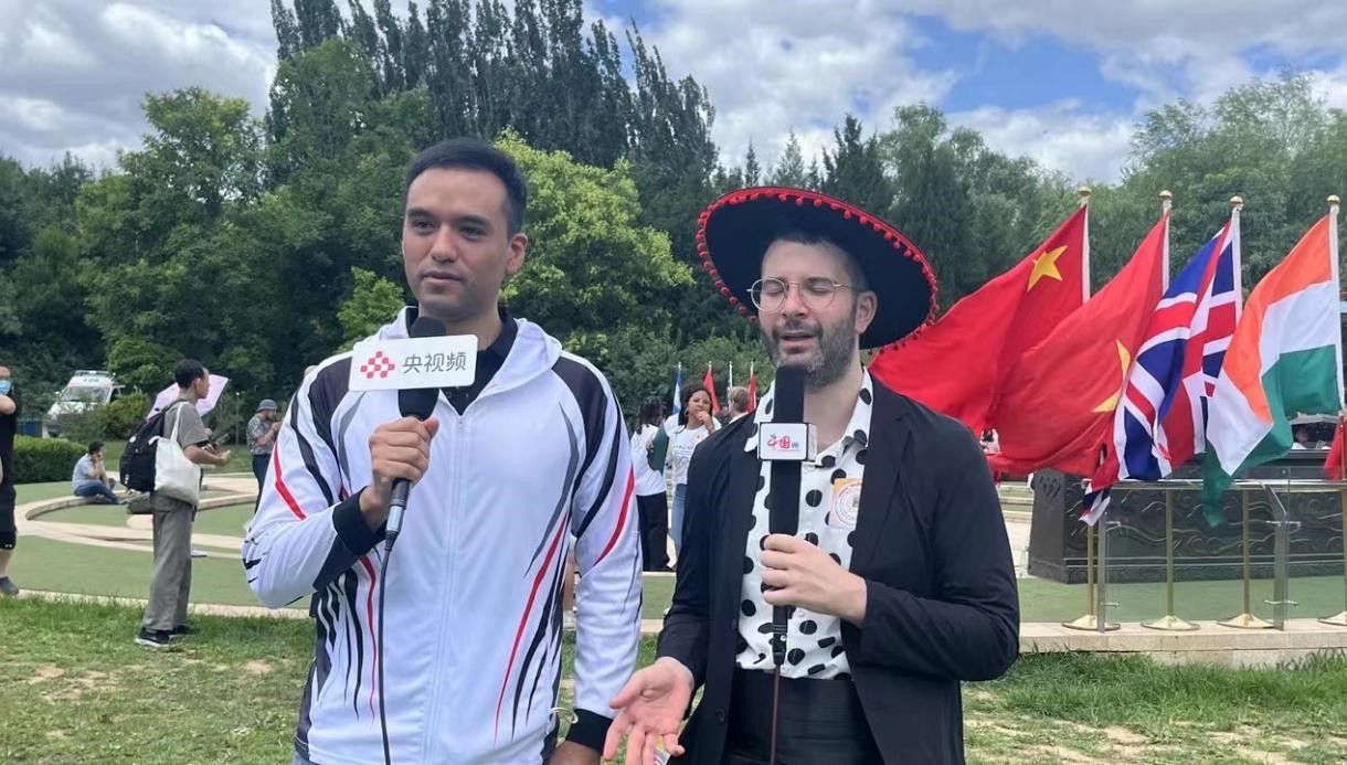 路易斯(左)来自墨西哥,可以说一口流利的中文,在镜头前,他侃侃而谈他在中国生活、学习的感受,“我意识到一些人对中国存在多么大的误解,这里完全是一个有爱的、包容的地方,这也是我学好了中文之后才发现的事。”冯贵(右)来自西班牙,他还不能用中文接受采访,但为了表达参加活动的心情,他坚持用英语完成了采访,“我很喜欢学校组织的各类活动,我得以有机会到处走走看看,认识不同的城市,了解不一样的中国。今天的活动以体育为主题,我和我的同学们都十分感兴趣,我觉得很开心。”