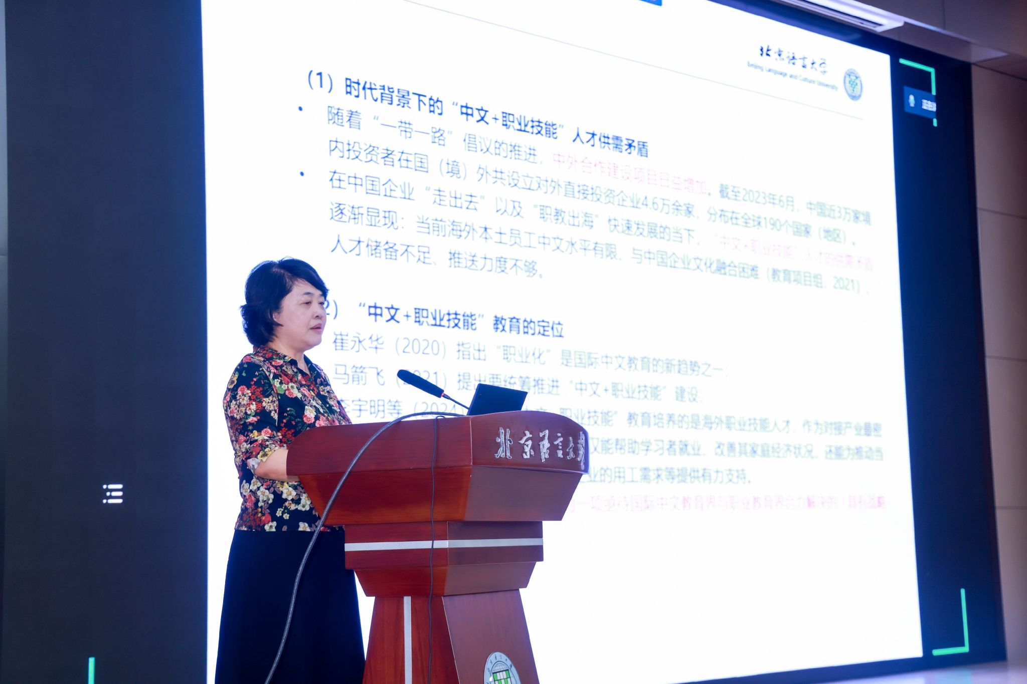 姜丽萍教授在大会报告《“中文+职业技能”人才培养:动因、目标与路径》中首先梳理了“中文+职业技能”人才培养的动因,主要包括历史发展内因和供需关系外因两大板块;其次界定了“中文+职业技能”人才的内涵特征,构建了能力框架,明确了人才培养的目标;最后围绕培养方案、课程体系、教学资源、教学模式和评价机制五个方面,就“中文+职业技能”人才的培养路径提出了具体建议,旨在精准培养市场所需的“中文+职业技能”人才,以期为国际中文教育与职业教育实现融合发展、迎来升级转型提供人才支撑。