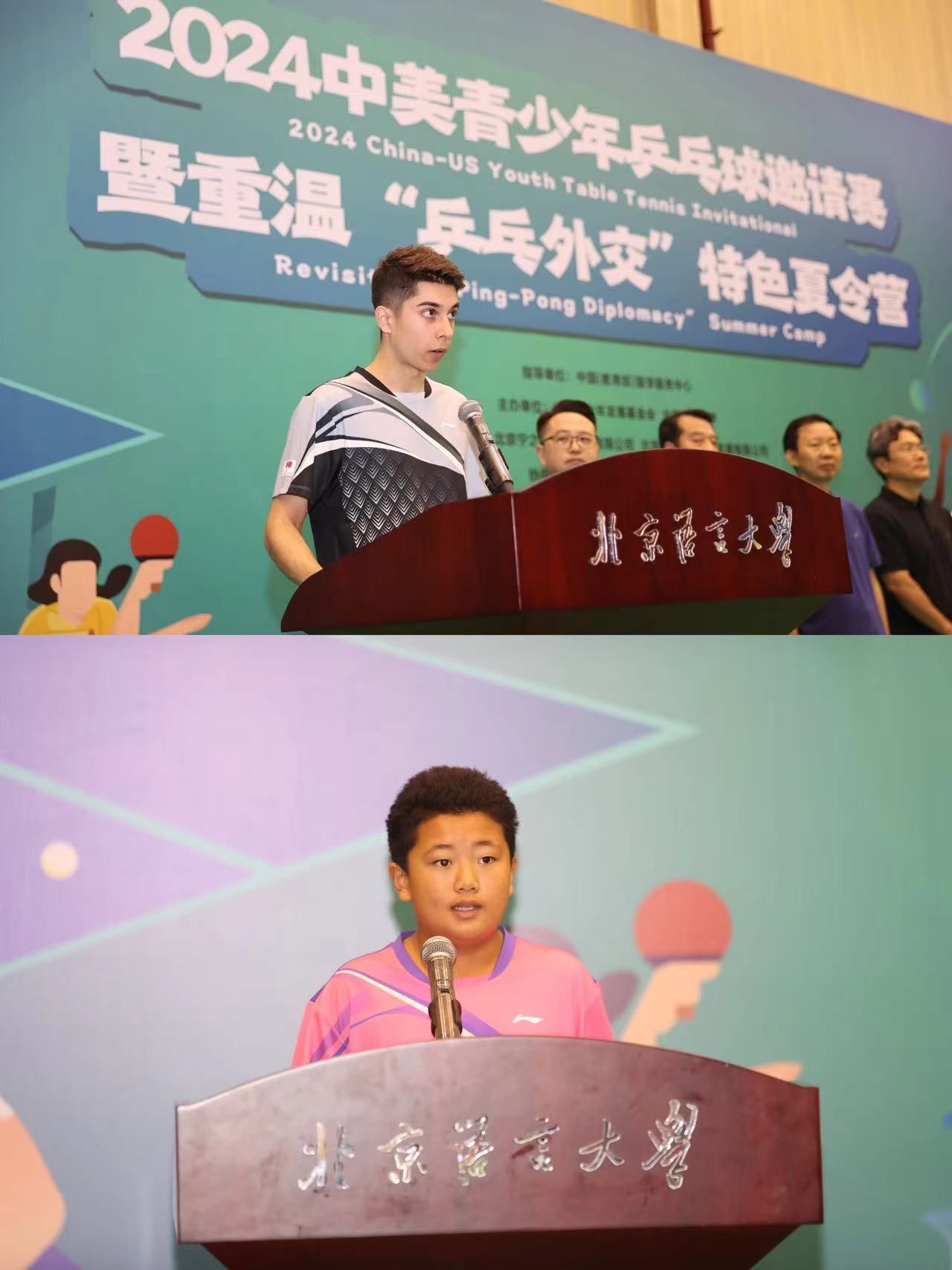 来自中美两国的青少年运动员代表相继上台发言,怀揣着对乒乓球运动的同样热爱,他们相聚赛场,为能参与本次活动而倍感荣幸。