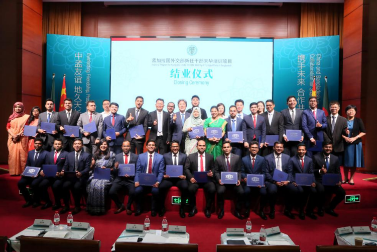 8月9日,孟加拉国外交部新任干部来华培训项目结业仪式在北京语言大学顺利举行。中国外交部亚洲司参赞陈伟、孟加拉人民共和国驻华大使馆经济参赞穆罕默德·莫米努勒·侯克·布希扬、北京语言大学副校长张宝钧以及项目承办单位国际中文教育实践与研究基地相关负责人、上海国际问题研究院院长陈东晓,参访机构代表中国国际问题研究院副院长刘卿、当代中国与世界研究院副院长孙明、北京智慧能源研究院、北汽新能源汽车股份有限公司等负责人与青年专家出席结业仪式。中国驻孟加拉人民共和国大使馆随员茹琪、高级政治专员兼研究主管莫尔赛杜尔·伊斯兰全程陪同代表团开展研修。