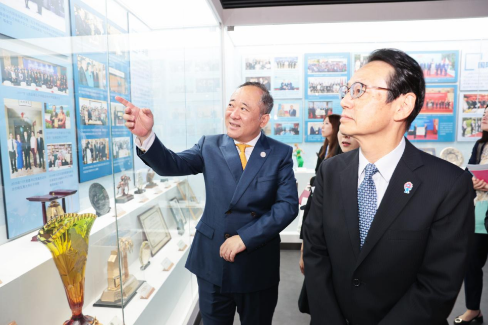 段鹏校长首先陪同金杉宪治大使参观了校史馆。段鹏校长以时间为轴,向金杉宪治大使一行展示了学校从初创时期的艰辛探索,到改革开放后的蓬勃发展,再到如今成为国内外知名的国际中文教育与研究高地的辉煌历程。特别值得一提的是,北京语言大学与日本教育交流历史渊源深厚,1980年,应中日两国元首有关发展中国日语教育的倡议,学校受教育部委托举办了中国日语教师培训班“大平班”,办学期间,日方先后派遣了95名专家来培训班讲学,160多所高校的594名日语教师参加了培训班进修,是中日教育友好合作的生动见证。北京语言大学作为中日交流的友好桥梁,在日本成立了海外分校东京学院,并与关西外国语大学及北陆大学共建两所孔子学院,不仅是汉语教学和中国文化传播的重要平台,更是加深两国人民相互理解和友谊的关键纽带。学校培养了许多杰出的日本校友,如前驻华大使高桥邦夫、日中友好议员联盟干事长近藤昭一、前日本驻华公使吉田雅治、日本驻广州总领事贵岛善子、前日本松山芭蕾舞团总代表清水哲太郎等,他们在中日友好合作的各个领域中发挥着重要作用。金杉宪治大使一行对我校的历史发展以及在语言教育与文化交流领域所取得的卓越成就有了更加全面和深入的了解,对我校为中日友好交流和人才培养做出的努力和贡献表示感谢。