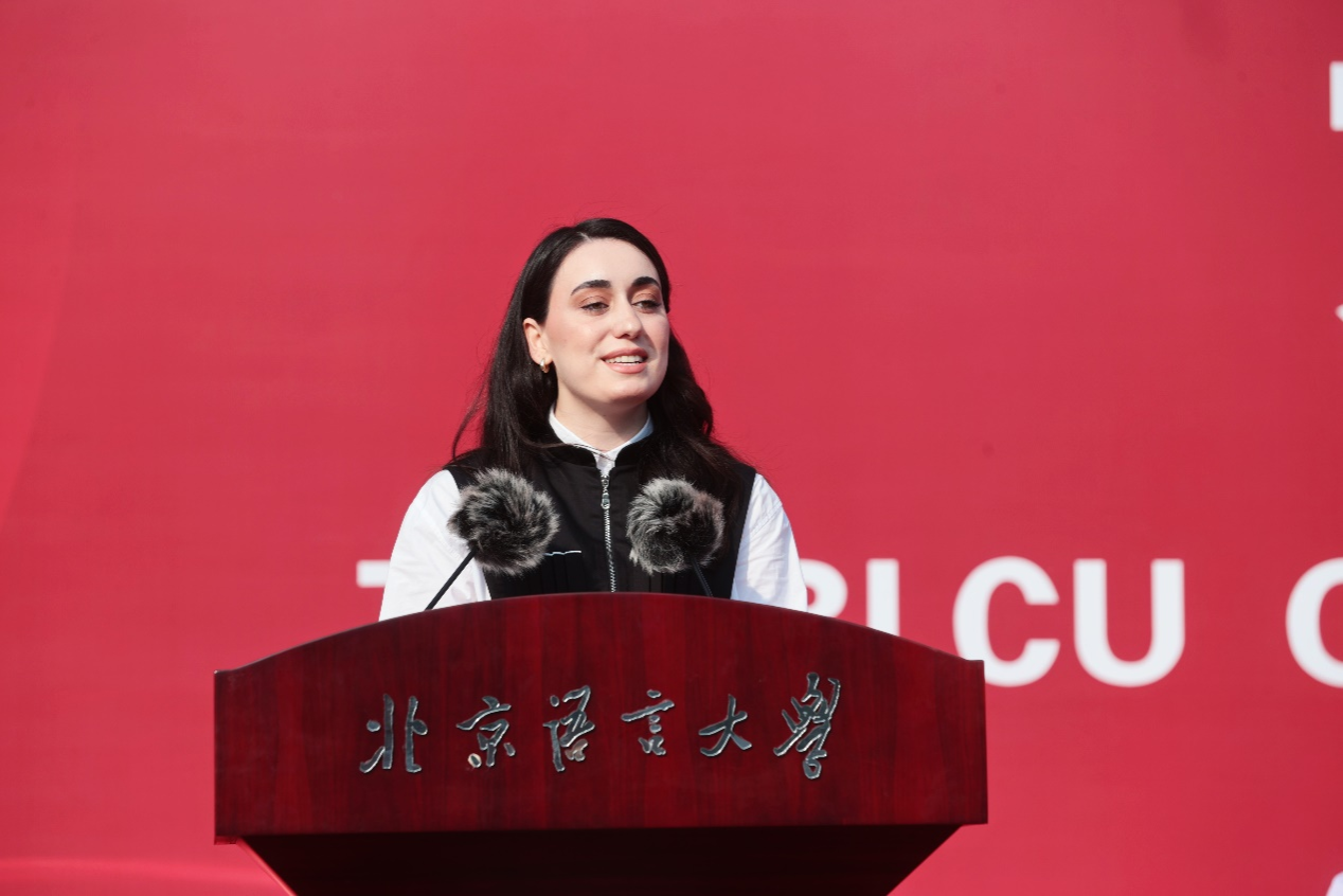 上午8时30分,开学典礼正式开始。在庄严的升国旗、唱国歌仪式后,外国语学部2024级播音与主持艺术(中英双语)专业本科生范思喆同学,国际中文学院2024级汉语国际教育专业博士生、来自格鲁吉亚的玛丽同学分别代表中外新生发言。范思喆同学分享了自己“圆梦北语”的过程、“筑梦青春”信念和“逐梦未来”的信心,号召全体新生传承北语多元、包容、独立的思想精神,用胸怀世界的东方智慧回应变动不居的世界格局,成为勇担大任的时代新人。玛丽同学回顾了自己十余年来的汉语学习和汉语教学之路,立志为更多格鲁吉亚学生打开中国语言与文化的大门,让更多人真正地认识、了解乃至爱上中文和中国文化,成为推动中格文化交流的使者。