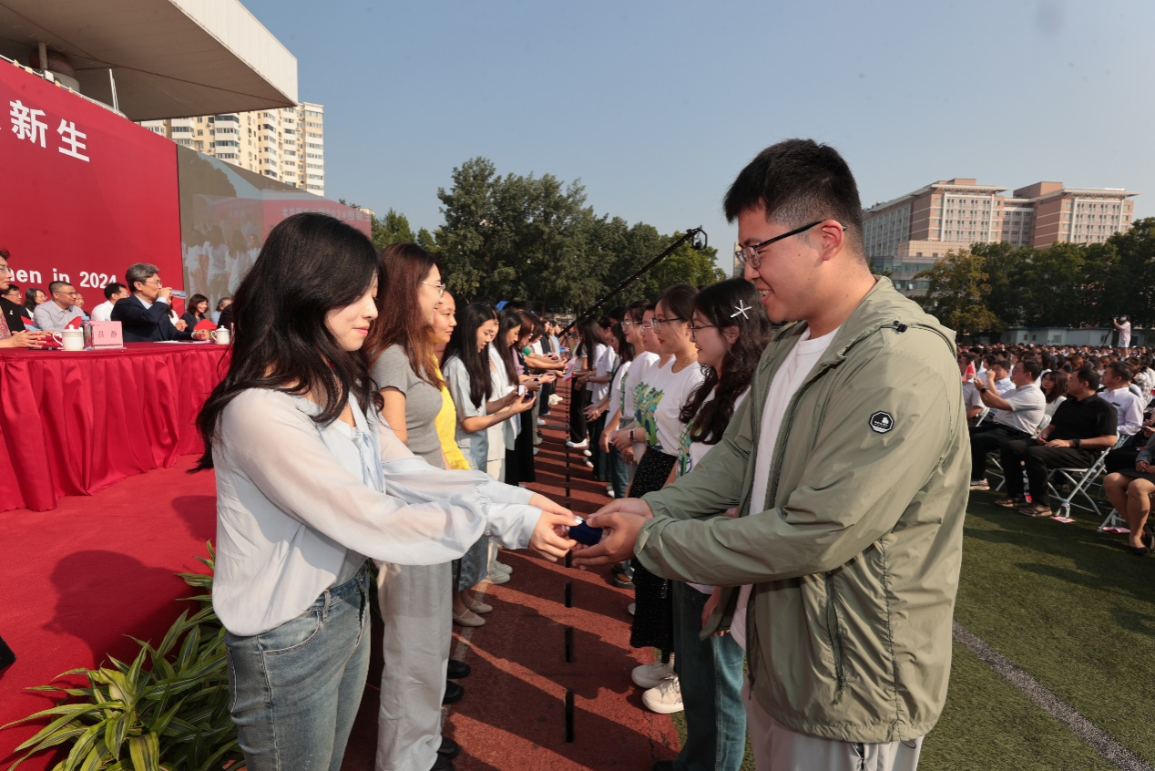 开学典礼还特别设置了辅导员为新生发放校徽仪式,来自各学部(院、系)的新生辅导员亲手将校徽交给学生。戴上北京语言大学校徽的那一刻,标志着新同学成为一名真正的北语人,辅导员将作为他们的陪伴者、引路人,见证他们成长,点亮他们前行的道路。