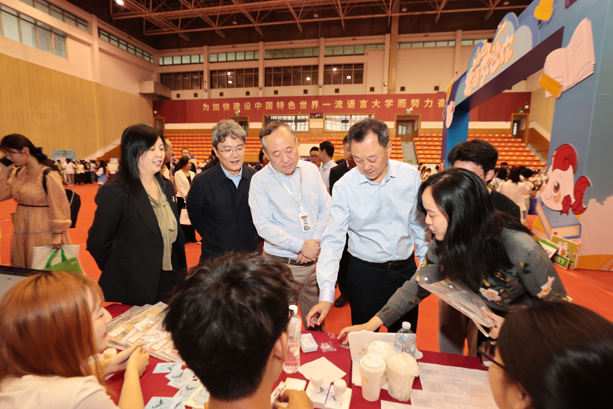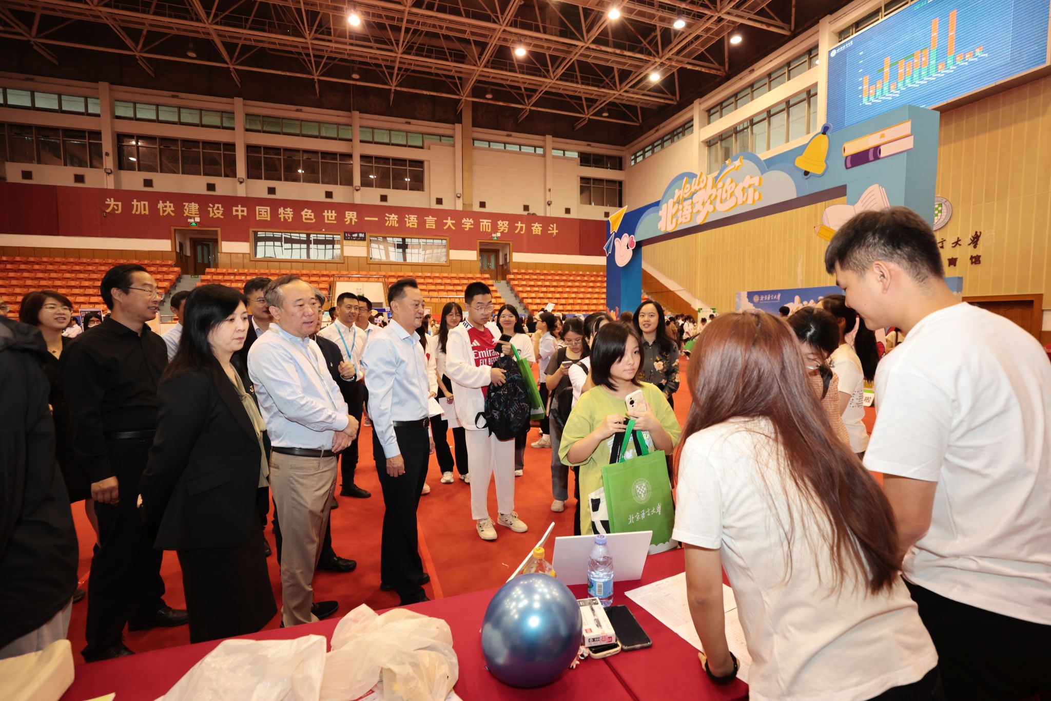 在逸夫体育馆前,学校的各类学生组织和社团设立了展台,他们用热情的介绍和精彩的表演,向新生们展示了北语丰富多彩的校园文化生活。大家纷纷来到展台前围观互动,寻找符合自己兴趣的学生组织和社团。身着红蓝马甲的党员先锋和志愿者,忙碌的身影在校园中穿梭,他们热情地协助新生搬运行李、指引方向、解答疑问,成为了校园中一道亮丽的风景线。