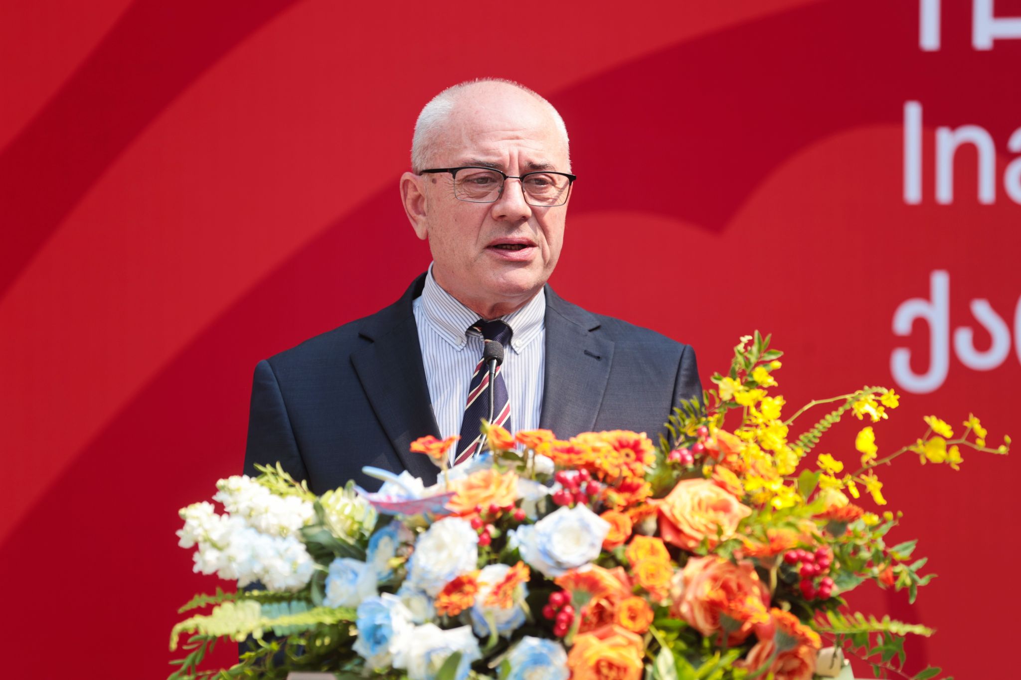 段鹏校长在致辞中表示,作为多学科协调发展的世界知名大学,北京语言大学致力于推进中外人文互解与多元文明互鉴,已经为全球189个国家和地区培养了近30万名通晓中文、熟悉中华文化的国际校友,其中包括格鲁吉亚著名汉学家玛琳娜教授等众多和平使者,在深化中格语言互通、推进中格人文交流、促进中格文明互鉴方面取得了系列积极成果。伊拉克利·加里巴什维利总理一行在去年7月访华时特地莅临北语,为鲁斯塔维利雕塑揭幕,谱写了我校中格交流史上的新华章,今天,雕塑落成仪式的举办,标志着中格交流再续新篇章。面向未来,北京语言大学将与格方携手,以人为本,加大中格语言人才培养的专业性;以诚为基,深化中格教育合作的联通性;以语为桥,拓展中格文明互鉴的内涵性。