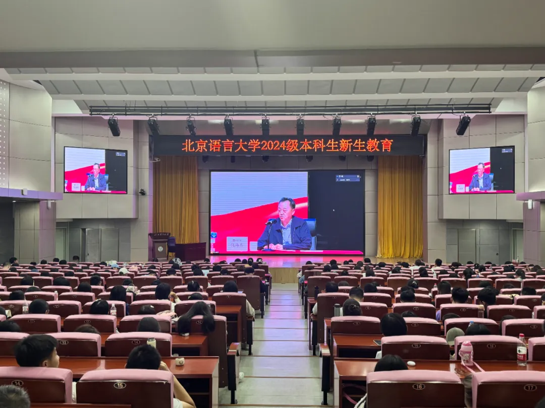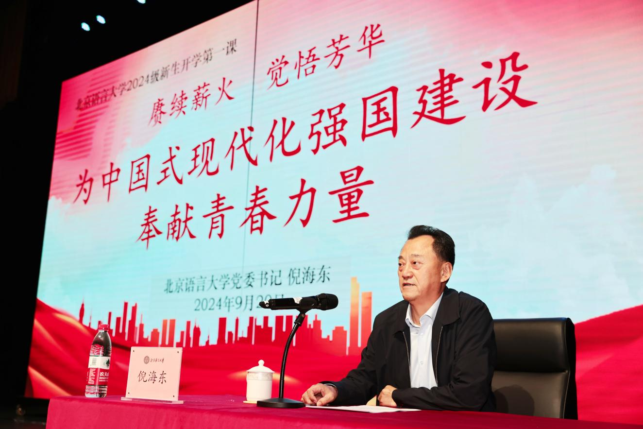 倪海东书记首先代表全校师生对2024级新同学的到来表示热烈欢迎,祝贺同学们开启了人生旅程的重要篇章,期望大家在北京语言大学书写辉煌的未来。倪书记以丰富的史料和生动的语言,回顾了新中国成立75年来的辉煌历程、中国人民从站起来到强起来再到富起来的伟大飞跃,回顾了北语建校62年来一代代北语人的奋斗历程。六十余载春华秋实,一代代北语人始终与国家同呼吸、共命运,为新中国的国际中文教育事业铺设了坚实的基石。倪书记特别介绍了学校早期赴巴基斯坦从事汉语教学工作,为汉语教学事业奉献终生的常敬宇教授与杨俊萱老师,高度赞扬了他们不畏艰难远赴海外,将自己毕生的精力奉献给这片语言与文化交相辉映的热土,甚至为中华文化走向世界献出自己生命的事迹。倪书记强调,站在新的历史起点上,学校步入高质量快速发展轨道,各项事业不断取得新突破,影响力持续提升,办学质量不断提高。当下,学校正致力于建设特色鲜明、多学科协调发展的高水平研究型大学,正在向着中国特色世界一流语言大学远景目标迈进,成就属于过去,未来仍需奋斗。倪书记号召同学们要矢志不渝地肩负起新时代青年的责任与担当,传承好一代代北语人的初心与使命,鼓励大家用青春力量为北语的发展注入新活力,与广大北语人一起携手共绘未来美好蓝图。