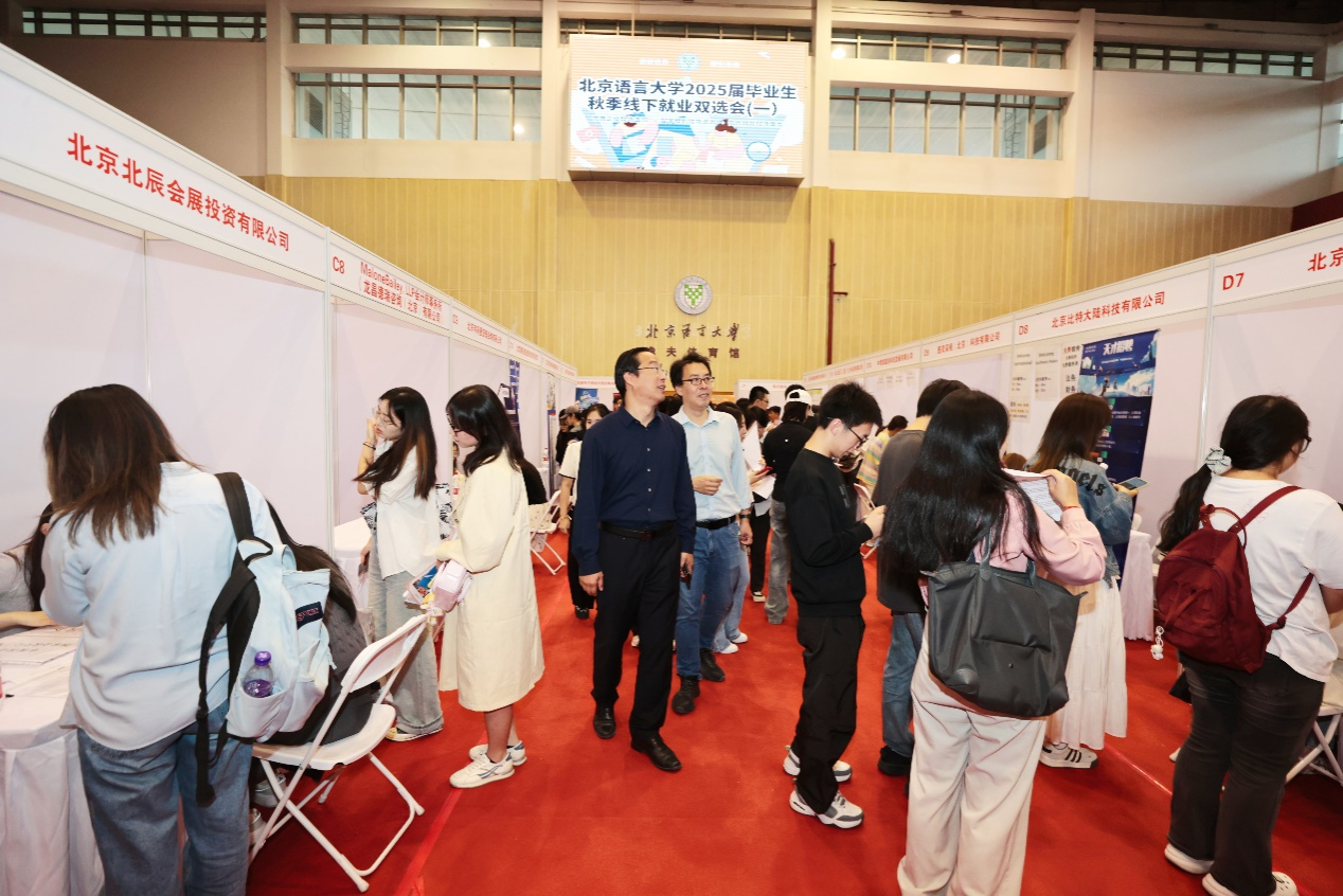 9月25日,“语通世界 职引未来”北京语言大学2025届毕业生秋季线下就业双选会(一)在逸夫体育馆顺利举行。黄益方副校长莅临双选会现场指导工作,听取本次双选会的规模设置和用人单位招聘需求。