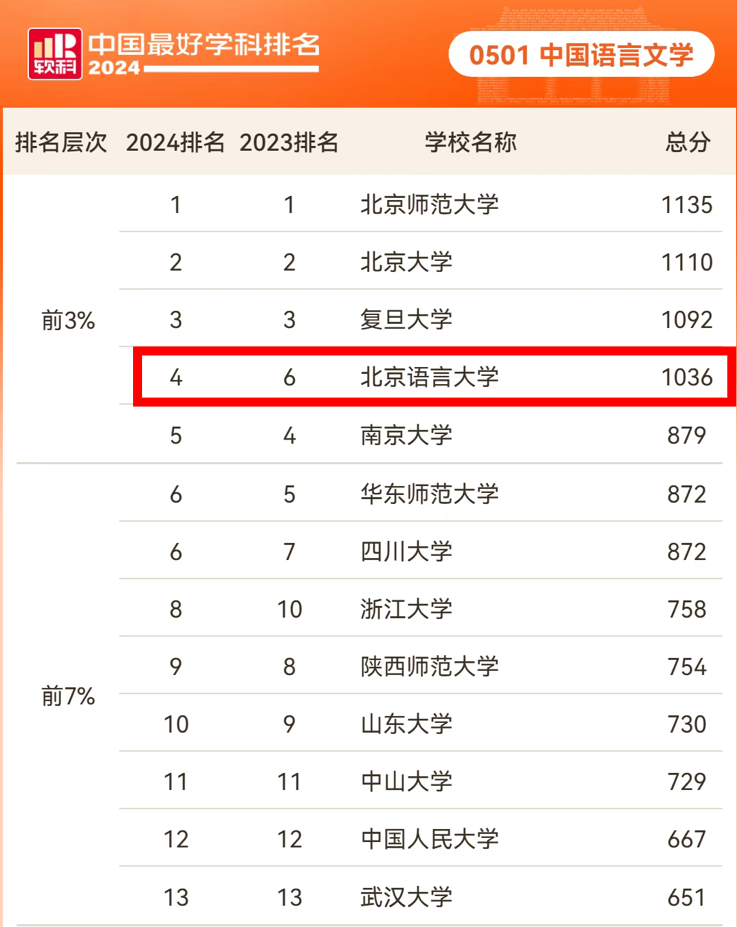 10月15日,高等教育评价专业机构软科正式发布了“2024软科中国最好学科排名”。排名榜单包括94个一级学科,各学科排名对象是在该一级学科设有学术型研究生学位授权点的所有高校(截至2023年底),共有486所高校的4924个学科点上榜。其中备受关注的中国语言文学一级学科上榜高校共94所,我校中国语言文学学科位列全国第4名,相较去年前进了2名,跻身全国高校前3%,取得显著进步。