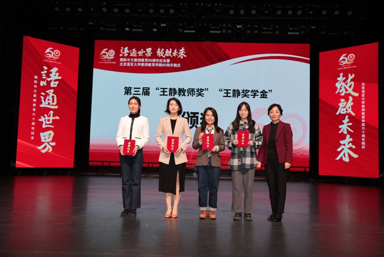 庆典大会上还举行了第三届“王静优秀教师奖”和“王静奖学金”颁奖仪式。北京语言大学党委常委、统战部部长吕静为获得“王静优秀教师奖”的郑航和刘敏老师,以及获得“王静奖学金”的兰天和张佩瑶同学颁奖。