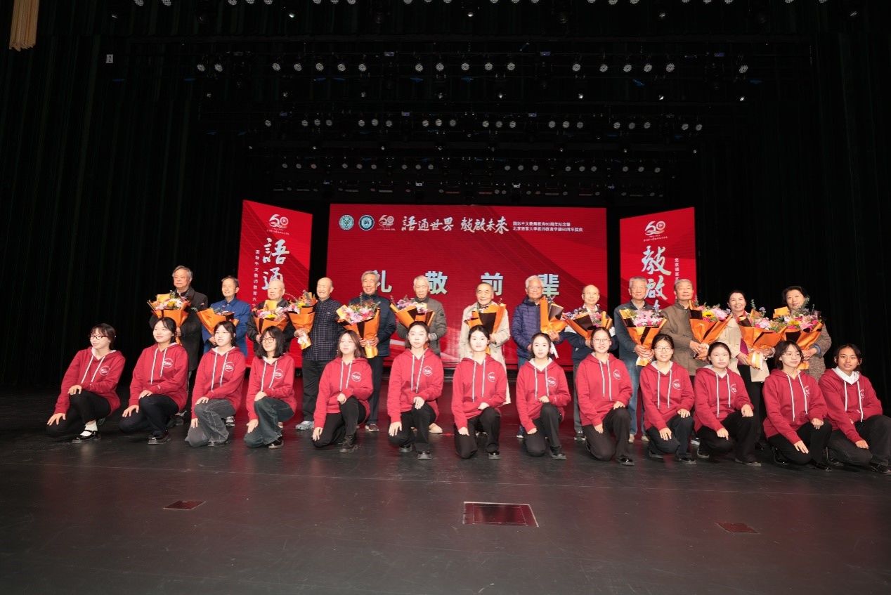 庆典上举行了礼敬前辈仪式。教师教育学院在校生们向前辈先生献花,感恩他们为国际中文教师教育事业和学院发展做出的卓越贡献。姜明宝先生代表老前辈、首届校友回顾了在北语求学、教学的美好时光,并勉励同学们要立至诚报国之志,胸怀天下、勤学笃行,做教书育人之楷模。