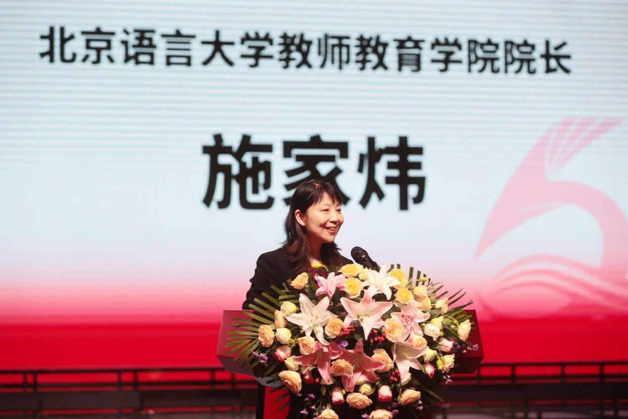 北京语言大学教师教育学院院长施家炜在致辞中向应邀出席本次庆典大会的领导、嘉宾、专家同行和校友致以衷心的感谢,向全球各地的全体校友表示真挚的祝福和问候,并向为国际中文教师教育学科体系和人才培养体系付出艰辛努力、做出卓越贡献的离退休老领导、老教师致以崇高的敬意。她介绍了教师教育学院的历史传承、发展和取得的重要成就,并表示学院未来将胸怀“国之大者”,初心不改,继承发扬校训精神,以教师神圣之责,担负起新时代所赋予的教育使命,坚持高起点谋划,高标准要求,高质量发展,在基础理论研究、专业内涵建设和理论实践探索等方面继续深耕,培养应新时代要求的德才兼备的国际中文卓越教师和中文国际传播卓越人才,奋力谱写新时代的新华章。
