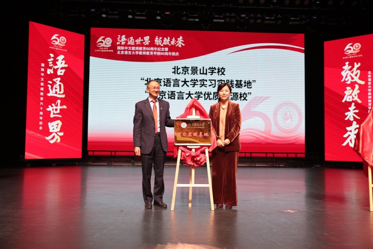 会上举行了北京景山学校“北京语言大学实习实践基地”“北京语言大学优质生源校”和北京语言大学“国际中文教材研发中心”揭牌仪式。北京语言大学党委副书记魏晖和北京景山教育集团党委书记、总校长李志伟为“北京语言大学实习实践基地”“北京语言大学优质生源校”揭牌。李志伟校长在致辞中向教师教育学院60周年院庆表示热烈祝贺,向学院在国际中文教师教育领域取得的成就表达深深的敬意,并期待在“三个面向”新内涵下,深化与学校的合作,积极探索大中小学一体化协同育人新路径。
