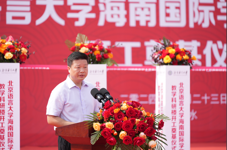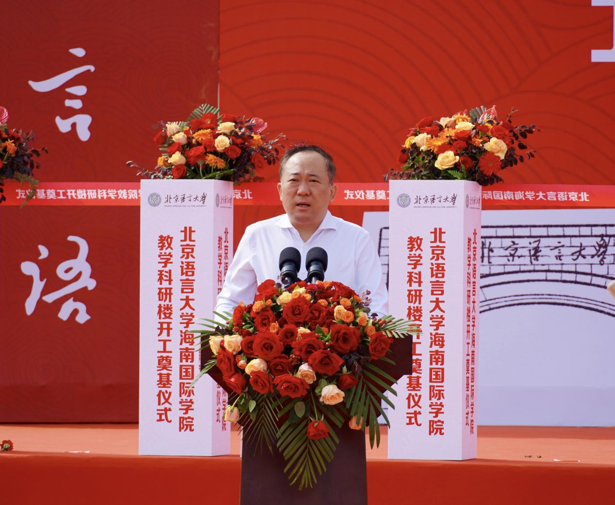 段鹏校长代表北京语言大学欢迎海南省人民政府李渝凤教育总督学、吴海峰书记、各位嘉宾、老师和同学们参加开工奠基仪式。段校长在致辞中说道,北京语言大学是教育部直属重点大学,学校诞生于新中国外交事业的艰难开创时期,是在周恩来总理的亲自关怀下创建的,毛泽东主席亲笔题写了校名。迄今为止,学校已培养了来自近200个国家的30余万名懂汉语、熟悉中华文化的外国留学生,包括各国政要、驻华使节及各领域的知名人士,其中外国大使300余位,外国副总理以上政要80余位。海南国际学院教学科研楼的建设,不仅能够为我校开展国际学术交流、举办国际会议和文化活动提供更好的条件,同时也会帮助海南陵水黎安国际教育创新试验区吸引更多的国内外优质教育资源,和兄弟院校一道共同促进海南国际教育创新实验区的发展。