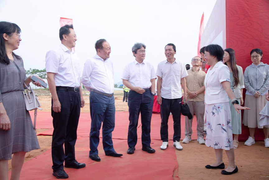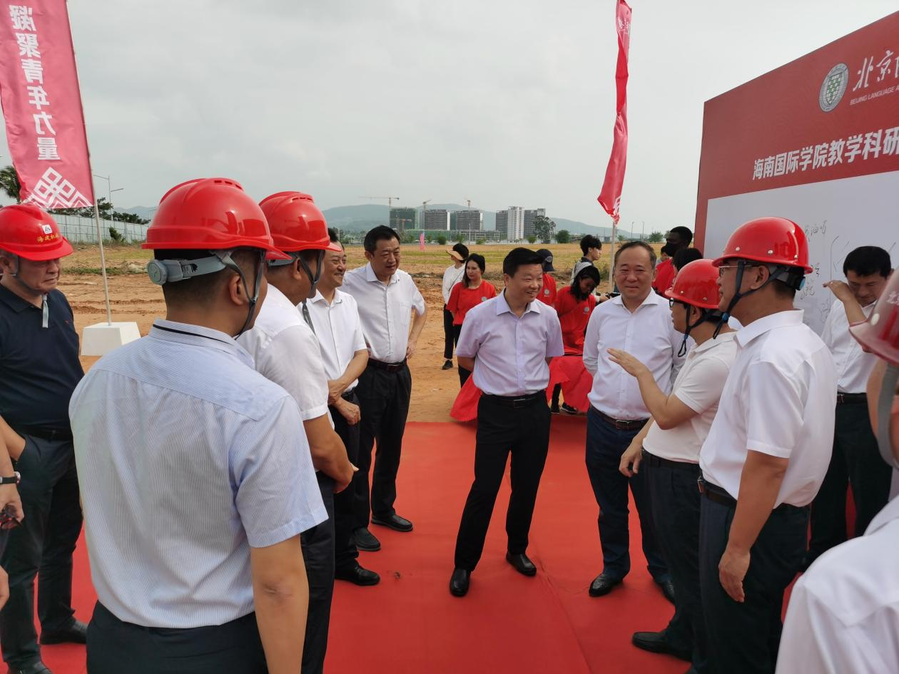 党委书记倪海东、校长段鹏、副校长张宝钧与陵水县县委书记、海南陵水黎安国际教育创新试验区管理局党委书记、局长吴海峰等领导与项目施工单位领导亲切交流,听取施工方汇报工程施工方案。
