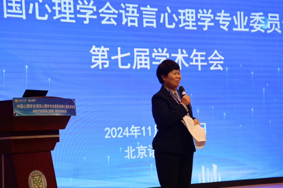 中国心理学会语言心理学专委会新任主任、华南师范大学心理学院“儿童青少年阅读与发展”教育部哲学社会科学实验室主任王穗苹教授在致辞中表达了对语言心理学界前辈的感激,并承诺将与专委会成员一起共同推动语言心理学的交流合作,结合人工智能技术探索新领域。她强调,在AI时代语言心理学研究需关注人性与智慧,利用大语言模型解决传统难题,为学科发展和服务国家战略贡献力量,并开启语言心理学研究新篇章。