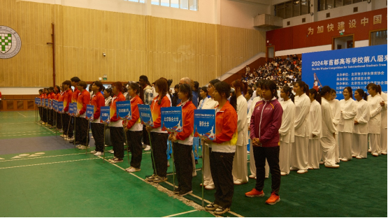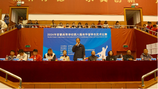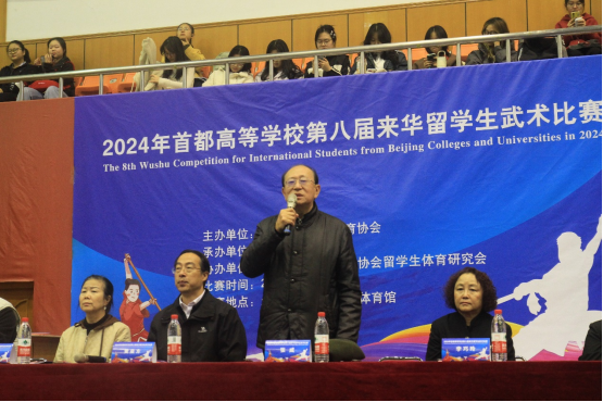 上午九时,开幕式正式开始。出席本次比赛开幕式的领导和嘉宾有:北京语言大学副校长黄益方,中国大学生体育协会民族传统体育分会教练委员会主任、武术国际A级裁判员、中国武术最高段位九段、北京体育大学中国武术学院教授李巧玲,北京市大学生体育协会秘书长张威,北京市大学生体育协会教学群体科研部主任范清惠,北京市大学生体育协会武术分会会长邢登江,北京语言大学体育教学部直属党支部书记陆文红,北京市大学生体育协会留学生体育研究会会长、北京语言大学体育教学部主任刘坤,北京市大学生体育协会留学生体育研究会副会长、中国石油大学(北京)文体学院院长唐亮,北京市大学生体育协会留学生体育研究会副会长、对外经济贸易大学体育部书记胡东旭,北京市大学生体育协会留学生体育研究会副会长、北京理工大学体育部主任赵汐。