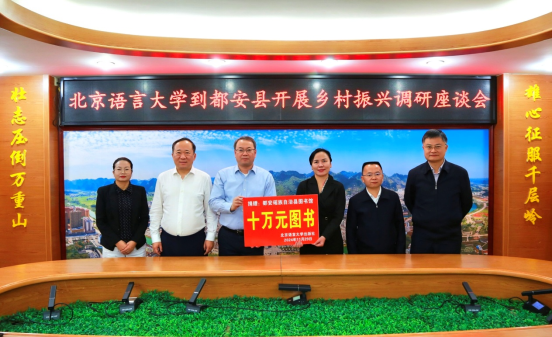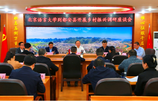 段鹏校长指出,我校在对都安的定点帮扶工作中,紧密结合地方需求,发挥学校优势特色。2024年7月,在教育部直属高校精准帮扶典型推选中,我校上报的“语言、教育、文化融合:三位一体赋能乡村振兴”成功获批精准帮扶项目。我校坚持高位推进乡村振兴和定点帮扶工作:一是强化组织领导,把乡村振兴和定点帮扶工作摆在了一个突出的工作位置,制定了定点帮扶工作要点,加强调查研究;二是优选挂职干部,挂职副县长和驻村第一书记都出色完成了各项任务;三是聚焦重点领域,特别是在民生、教育、产业、文化和人才培训等方面,落实了一系列实实在在的帮扶举措,汇聚了当地民心。当前我校各项事业欣欣向荣、蓬勃发展,这使得我们更有信心让服务都安地方的各项部署更加扎实、有效落地。接下来,我校还要持续推进对都安县的教师和公职人员培训、图书馆内容建设、农副产品推广销售、志愿者选派等工作,更好助力都安乡村振兴事业发展。