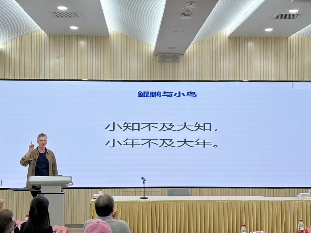 张威雨同学从自己独特的视角出发,带来了他对《庄子》的新颖诠释。他超越了传统的解读框架,通过分享几则寓意深远的哲理故事,为我们呈现了他对这部古典哲学著作的独到见解。他的讲解深入浅出,使得听众在轻松愉悦的氛围中领悟到了《庄子》的深邃智慧。他特别强调:“阅读《庄子》,重要的不是被‘误导’,而是要‘悟到’。”他鼓励我们不要盲从,而是要学会深入探索并领悟生命的真谛。