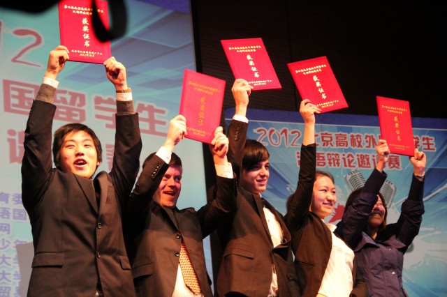 11月25日上午,“2012北京高校外国留学生辩论邀请赛决赛”在我校逸夫报告厅举行。经过激烈的角逐,我校留学生辩论队战胜强队北京师范大学队赢得冠军,实现四连冠。我校荣获“优秀组织奖”。北京市教育委员会郑登文委员、教育部国际合作与交流司、北京市教委、北京市外办有关领导及我校戚徳祥副校长应邀出席大赛并为获奖选手和高校颁发证书。