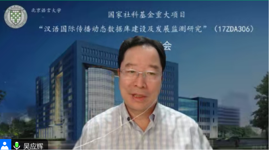 2024年9月8日,国家社科基金重大项目“汉语国际传播动态数据库建设及发展监测研究”(项目编号:17ZDA306)结项鉴定会在北京语言大学以线上会议的形式正式召开。武汉大学赵世举教授担任会议鉴定专家组组长,专家组成员有浙江师范大学王辉教授、华南理工大学安然教授、华中师范大学李向农教授、厦门大学苏新春教授、上海师范大学陈昌来教授和中国社会科学院语言研究所张伯江研究员。项目首席专家吴应辉教授以及各子课题负责人和课题组核心成员出席会议。