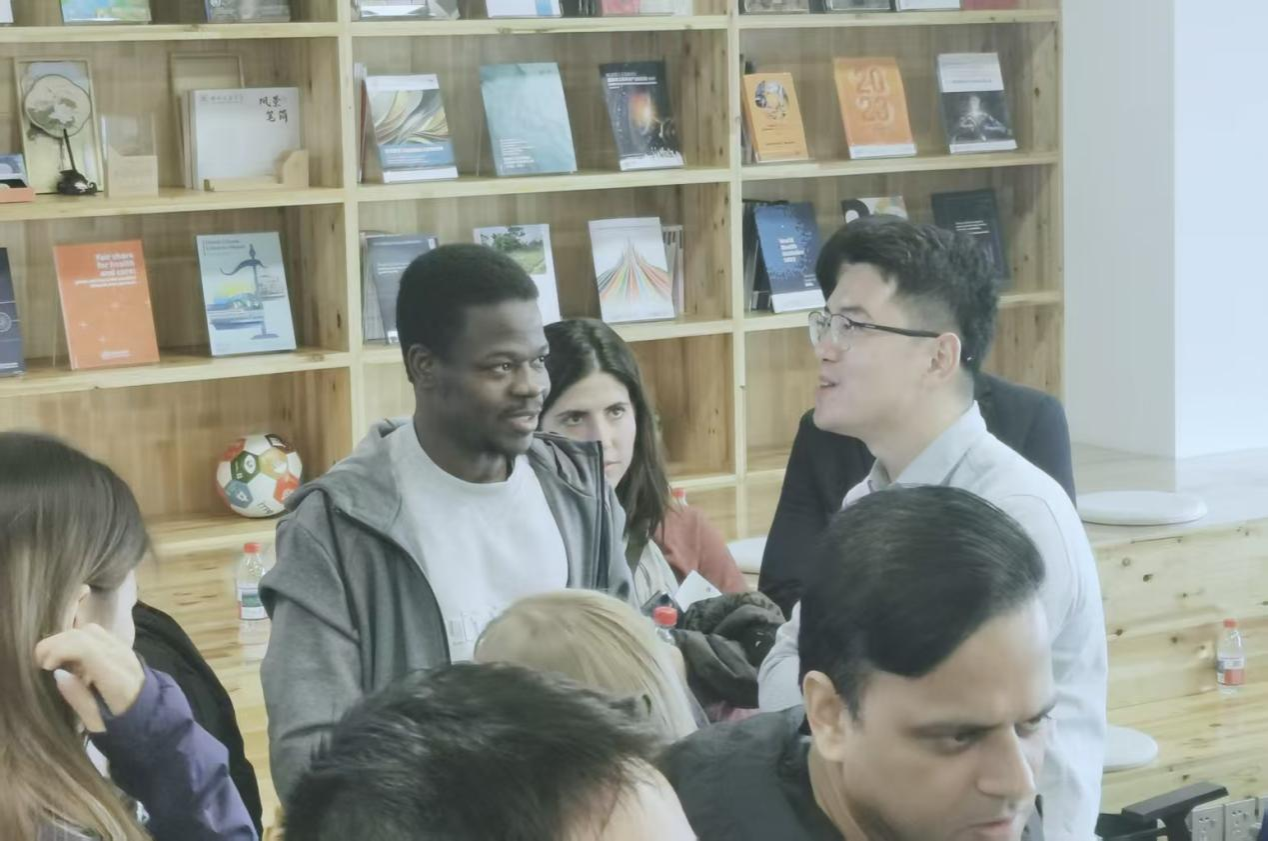 北语贝宁学生劳伦斯在交流会后与创业者交流