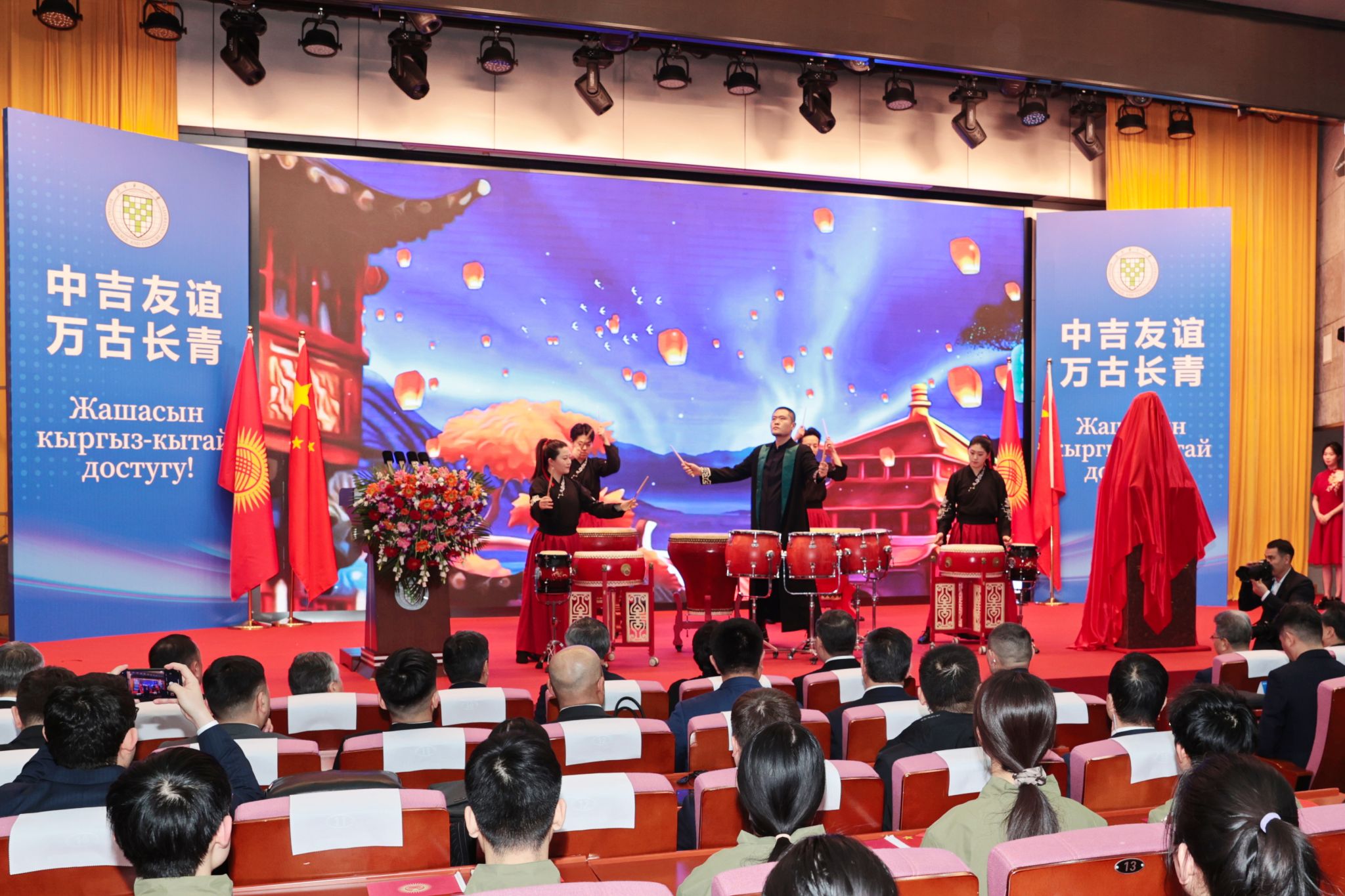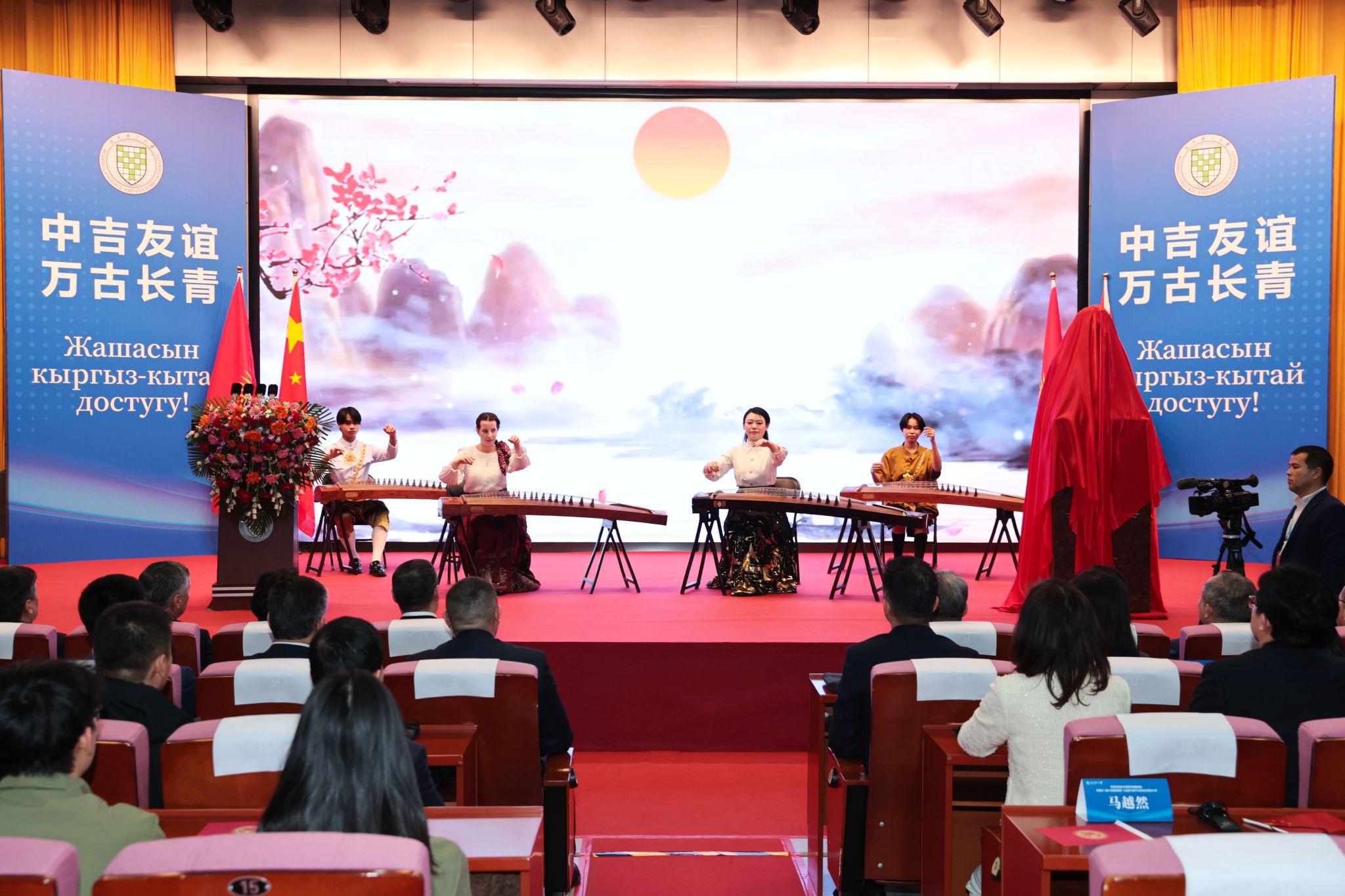 随后,古筝重奏《渔舟唱晚》缓缓响起,古筝的音色古朴典雅,重奏之下凸显这一传统乐器的韵味悠长,这不仅是一场音乐的盛宴,更是一次对中华文化的深刻体验和传承,促进了中吉文化的交流与融合,共筑中吉友谊万古长青。