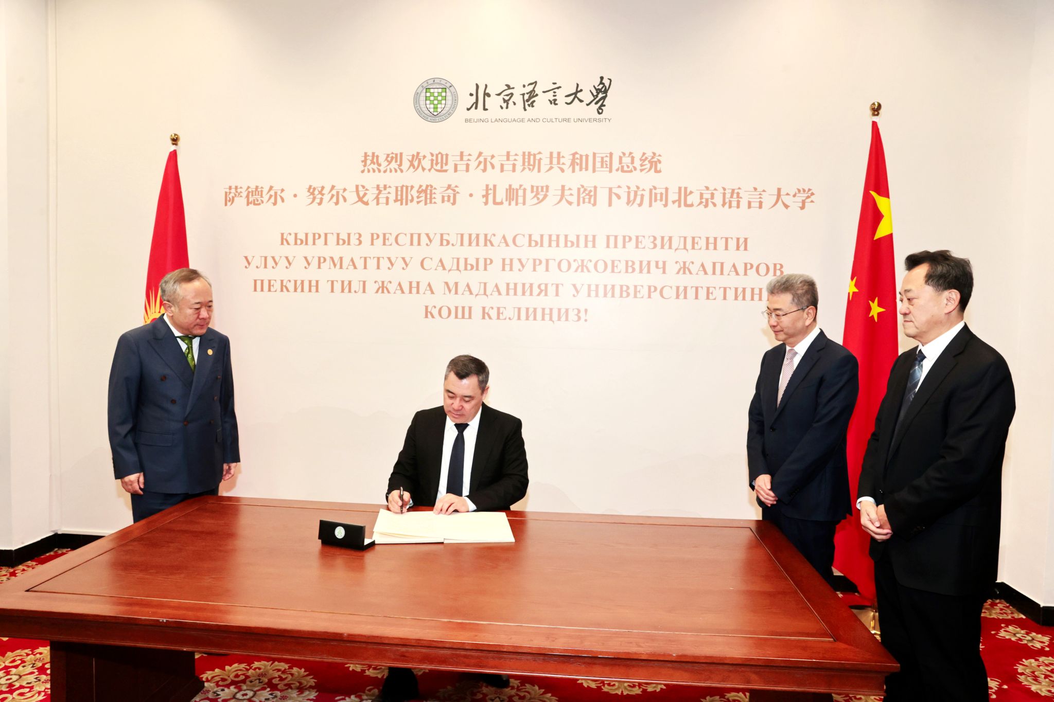校长段鹏致欢迎辞。段鹏校长表示,中国与吉尔吉斯斯坦是山水相连的友好邻邦,在习近平主席和扎帕罗夫总统阁下的战略引领下,双方建立了新时代全面战略伙伴关系,各领域合作蓬勃发展。北京语言大学作为中国教育部直属的重点大学,一直致力于中外人文交流和文明互鉴事业,是培养知华友华国际人才的重要基地,为全球189个国家和地区培养了近30万名通晓汉语、了解中华文化的国际学生,其中包括80多位副总理以上政要以及300余位外国大使。自1992年以来,北京语言大学累计培养了340名优秀的吉尔吉斯斯坦籍学生。他们是中吉交流的见证者、受益者,同时也是传播者和建设者,为增进两国人民之间的理解和友谊发挥了重要作用。北京语言大学期待与吉尔吉斯高校在汉学与中国学、国际中文教育、语言科学研究、区域国别研究等领域建立更为广泛的合作关系,支持吉方高校相关学科的发展,促进双方教育文化交流,共享文明成果。感谢总统阁下一行为北京语言大学送来了艾特马托夫先生的雕像。未来,中吉两国的人民,尤其是来自世界各国的青年学子,将欢聚在北京语言大学和园的艾特马托夫雕像周围,开展学术交流、音乐表演和读书休憩,势必会让和园的土地焕发文明互鉴的蓬勃生机。