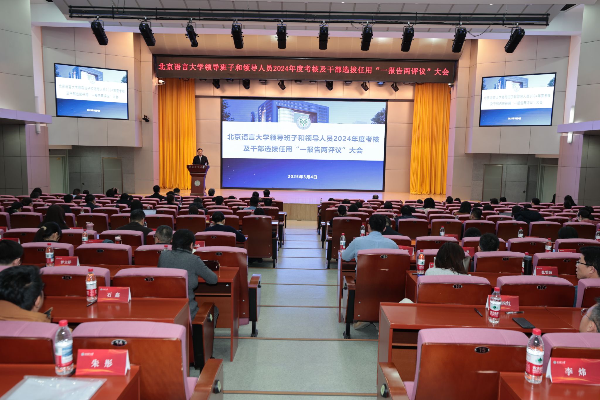 北语新闻网3月5日电(通讯员 郝博闻 摄影 魏达)根据教育部的部署和要求,3月4日下午,校领导班子和领导人员2024年度考核及干部选拔任用“一报告两评议”大会在教一楼209报告厅举行。校领导、校党委委员和纪委委员、全体中层干部、各级“两代表一委员”、校学术委员会主任和副主任、教代会执委会主任和副主任、基层党员干部教师代表、民主党派负责人和无党派人士代表、离退休人员代表等参加会议。倪海东书记主持会议。