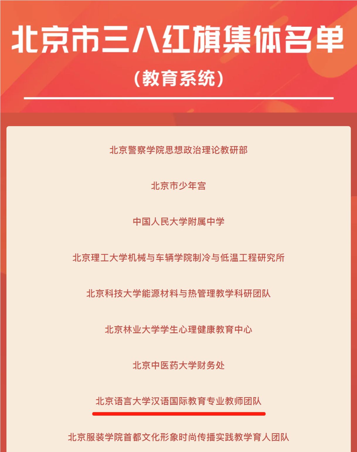 北语新闻网3月7日电 为表彰先进、树立榜样,激励首都广大妇女自尊自信、自立自强,奋进新征程、建功新时代,近日北京市妇女联合会、北京市总工会、北京市人力资源和社会保障局联合开展了北京市三八红旗奖章和北京市三八红旗集体评选表彰工作。我校汉语国际教育专业教师团队荣获“北京市三八红旗集体”称号,这也是我校首次获得该项殊荣。