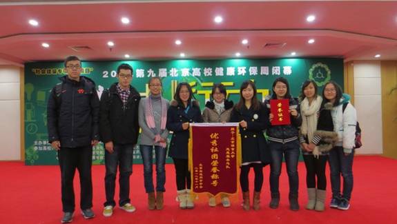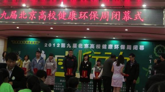 我校志愿服务总队环保部荣获2012第九届北京高校健康环保周优秀社团奖、环保部何耿包揽了优秀社员奖、优秀奖、摄影优秀奖三个奖项;杨耀、周婷获得主题征文二等奖;陈俊获得主题征文三等奖;贾梦珂获得了优秀社员奖。这次北语总队环保部一次包揽了八个奖项,满载而归。最后,城市学院建设党支部书记张晓红、北京化工大学环保志愿者协会邢舟分别代表老师和获奖学生发言,著名食品安全与环保专家董金狮教授代表承办方做活动总结。