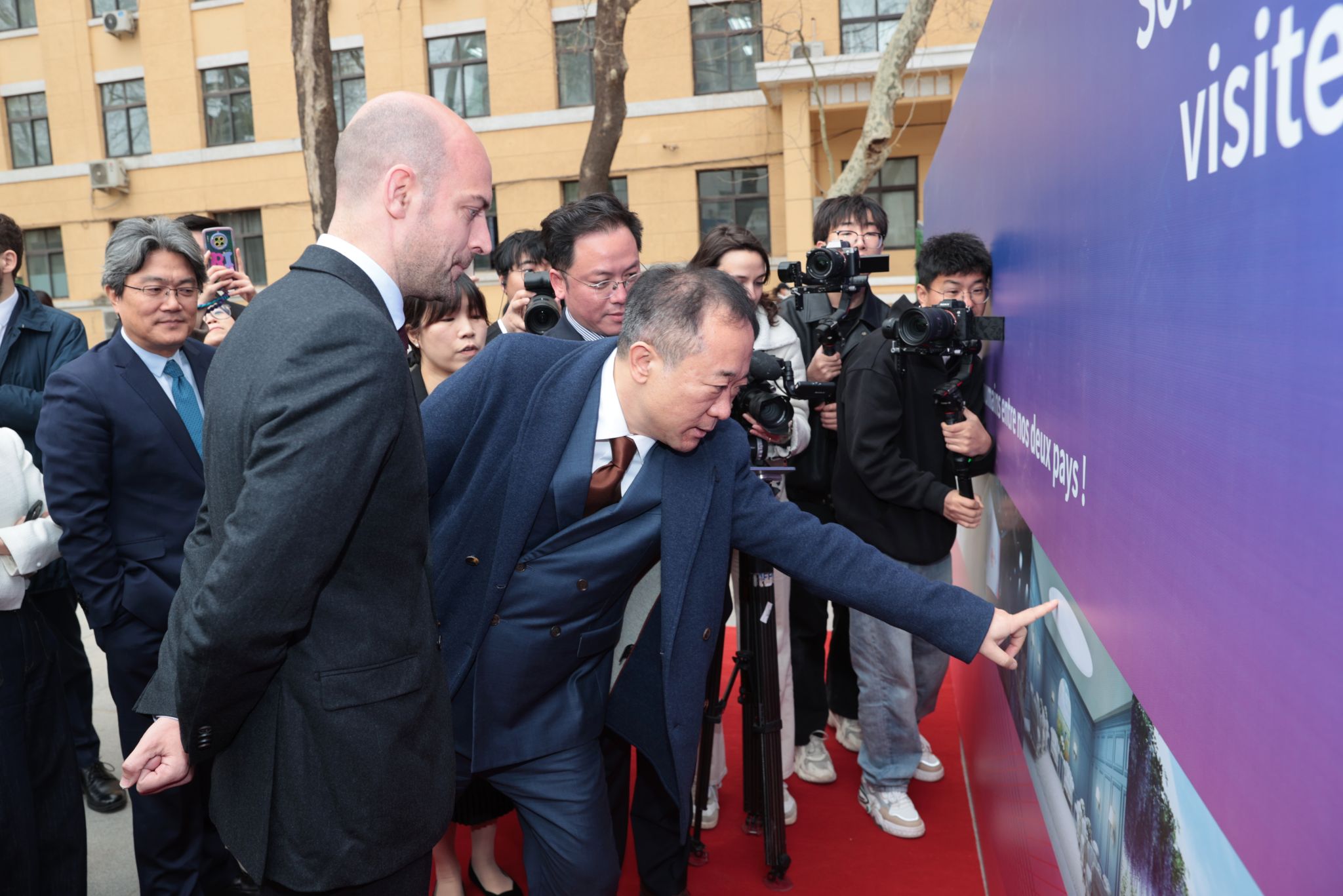 在逸夫报告厅外的广场上,段鹏校长向巴罗外长详细介绍了中法人文交流空间的设计概念,并陪同实地考察了中法人文交流空间项目施工情况。这一承载着中法进一步友好交流的重要空间即将开幕,巴罗外长对此表示了由衷的祝贺。