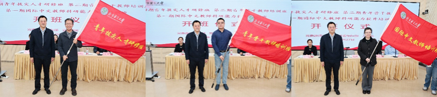 北语新闻网3月31日电(通讯员 伟尼拉 摄影 魏达)3月27日,学校2025年春季青年教师培训班暨第四期青年拔尖人才研修班、第二期青年骨干教师培训班和第一期国际中文教师科研能力提升培训班举行开班仪式,学校党委书记倪海东出席开班仪式,宣布开班并向学员代表授旗,讲授师德师风第一课。开班仪式由魏晖副书记主持,相关职能部门负责人和培训班学员参加开班仪式。本次培训班由党委教师工作部、党委组织部、人事处联合举办。