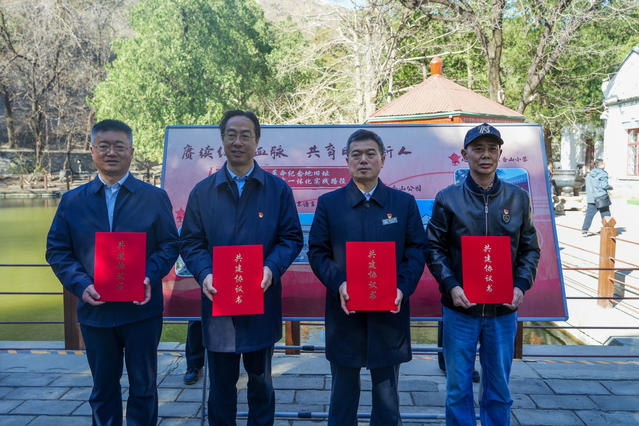 党委常委、副校长黄益方代表学校与香山公园党委书记、园长陈志强、北京市海淀区教师进修附属实验香山分校校长董红军、北京市海淀区香山小学书记、校长司常水共同签订《红色文化教育基地共建协议书》,并“点亮”大思政课协同育人计划。